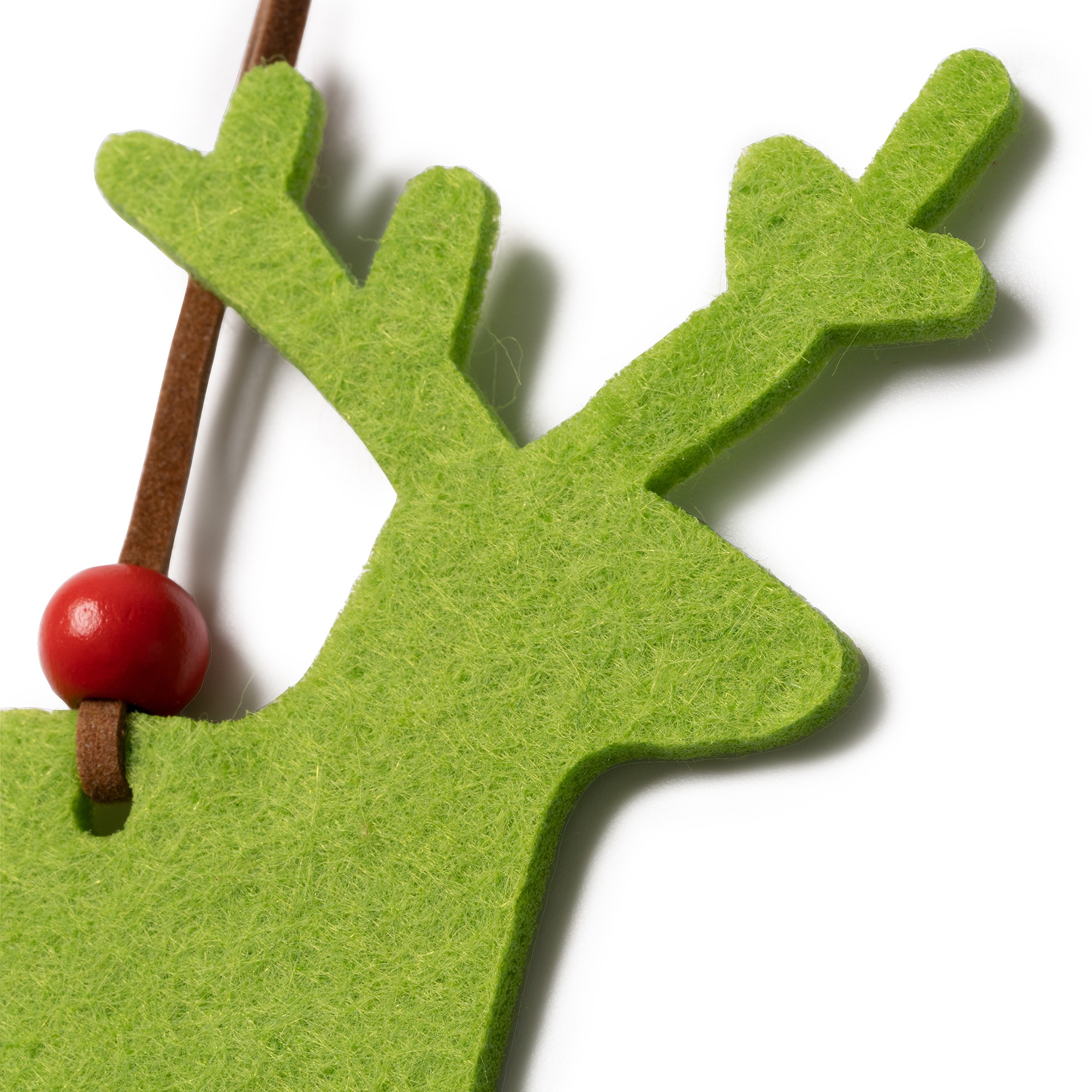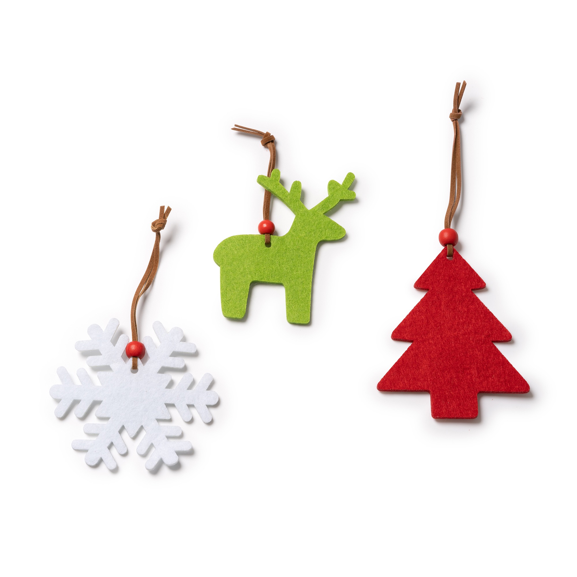 Ornamento natalizio in feltro. Disponibile in tre modelli: fiocco di neve, albero e renna. Tutti i disegni sono dotati di spago marrone e perlina rossa alla fine.