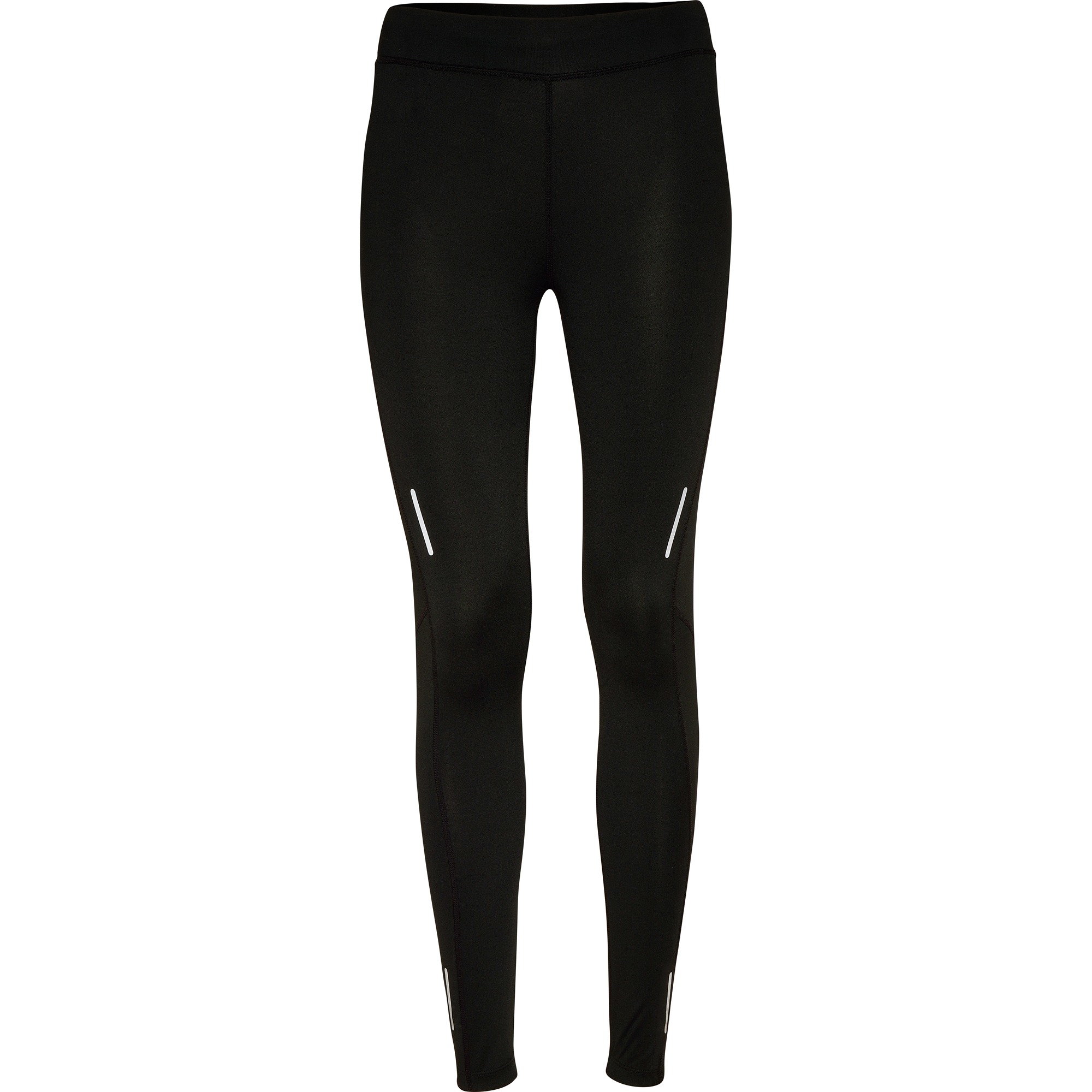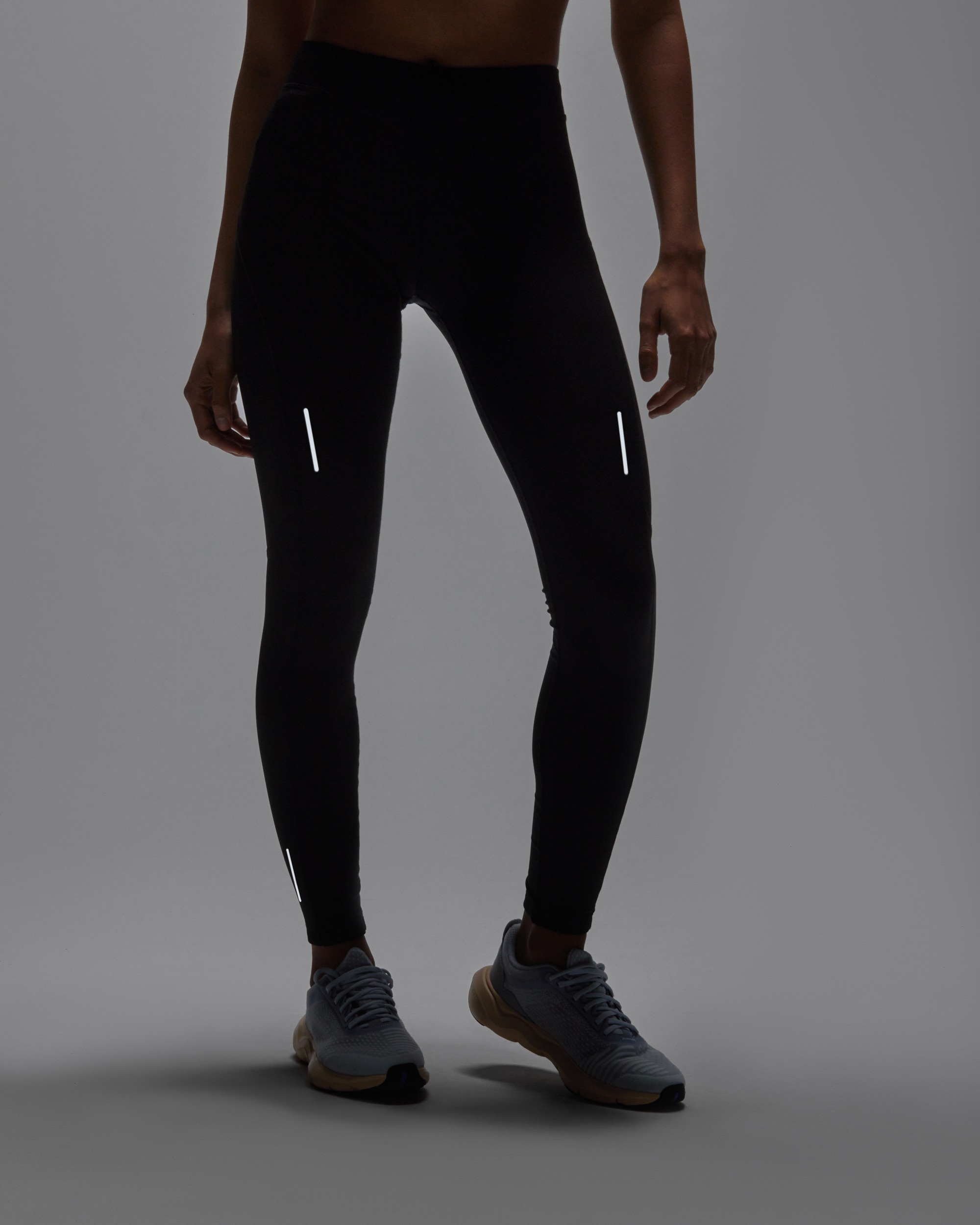 Leggings donna da corsa traspiranti a lunghezza intera. Girovita elasticizzato con cordoncino incrociato regolabile. Dettagli riflettenti. Mini tasca posteriore.