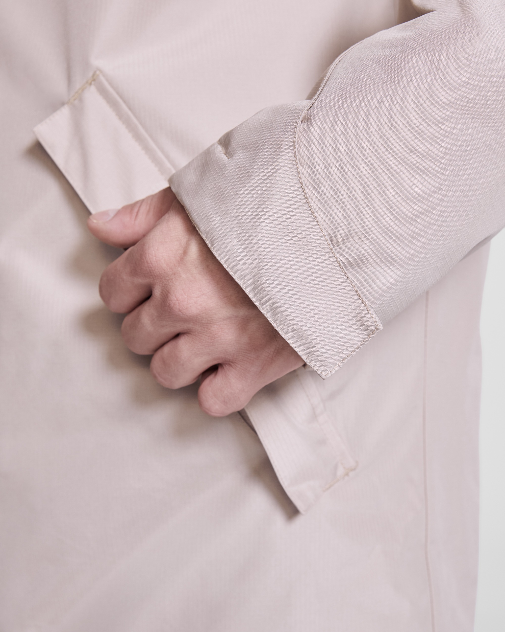 Parka imbottito con cappuccio removibile e regolatori elastici. Materiale impermeabile. Zip frontale abbinata coperta da un’ampia patta in tessuto uguale. Polsini regolabili con velcro. Tasche laterali con zip abbinate e coperta da una pattina in tessuto abbinato. Tasca interna sul petto a sinistra. Accesso interno per la rilavorazione. Certificazione GRS.