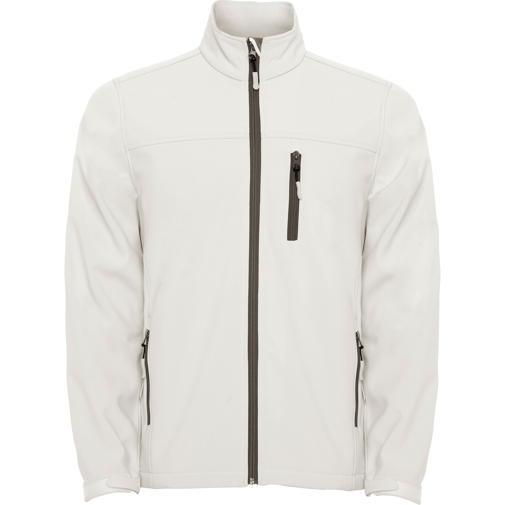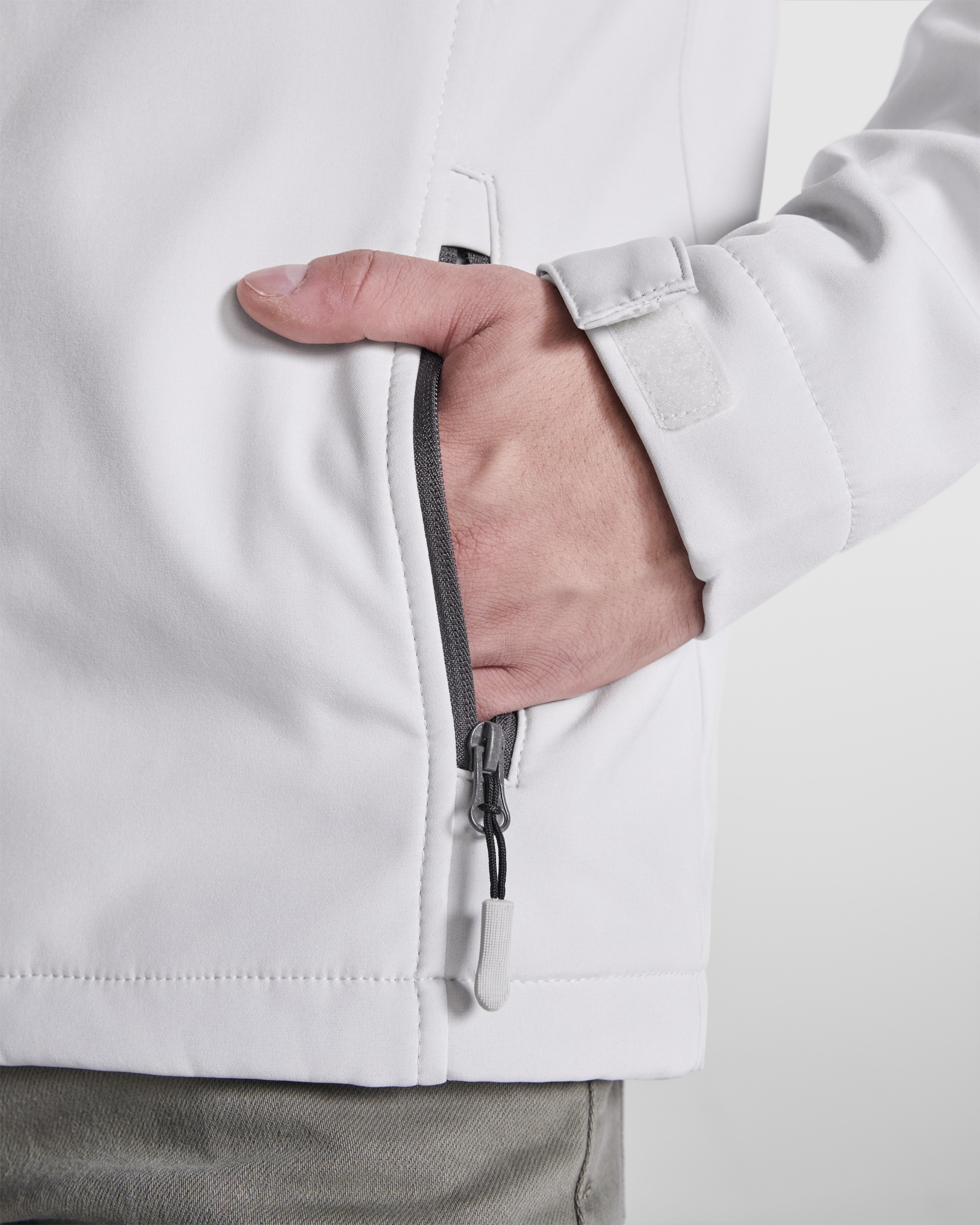 Giubbotto softshell a 2 strati con zip frontale invertita a contrasto. Foderato in tessuto micropile. Due tasche laterali e una tasca sul petto a sinistra con cerniere invertite a contrasto. Protezione per il mento in tessuto uguale sul rovescio. Regolatori laterali interni in taglie da adulto.