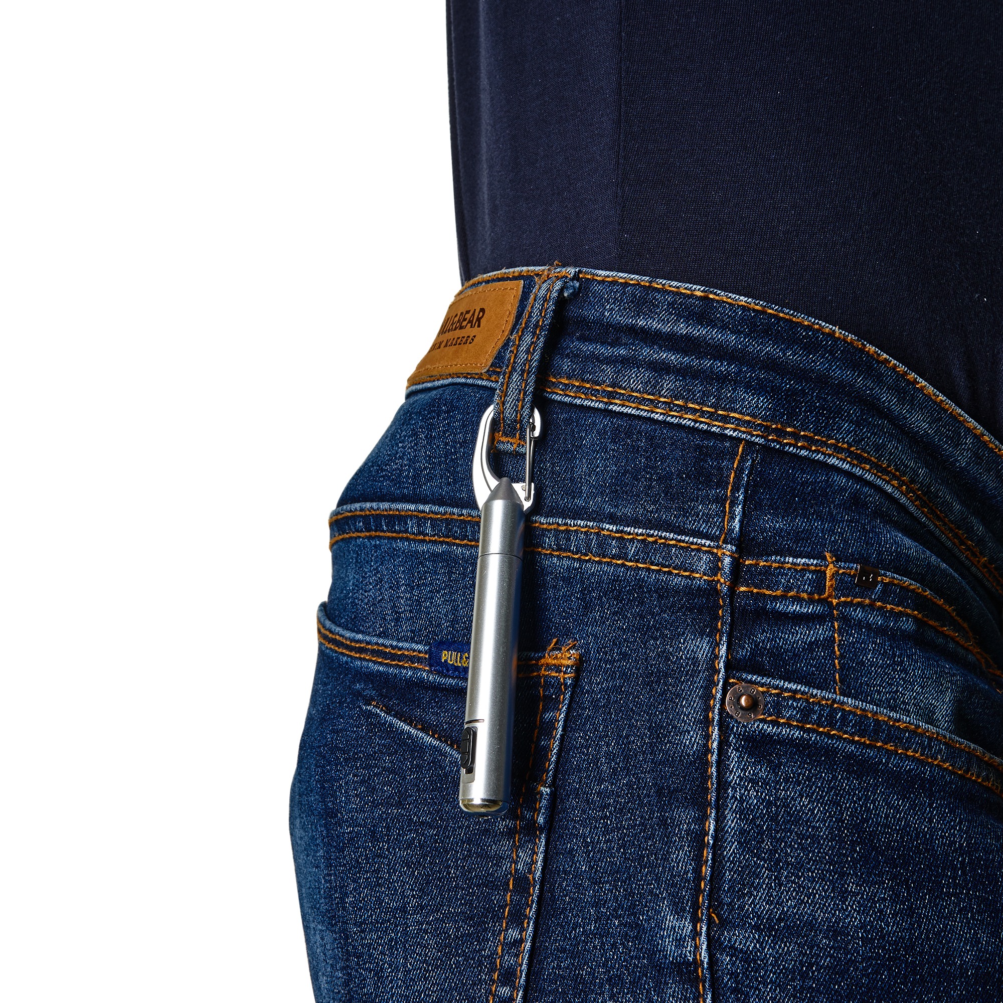 Penna a sfera con torcia a luce LED, disponibile in vari colori con finitura metallizzata e pulsante nero. Moschettone integrato nel cappuccio. Refil blu.