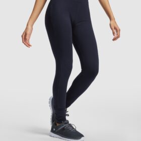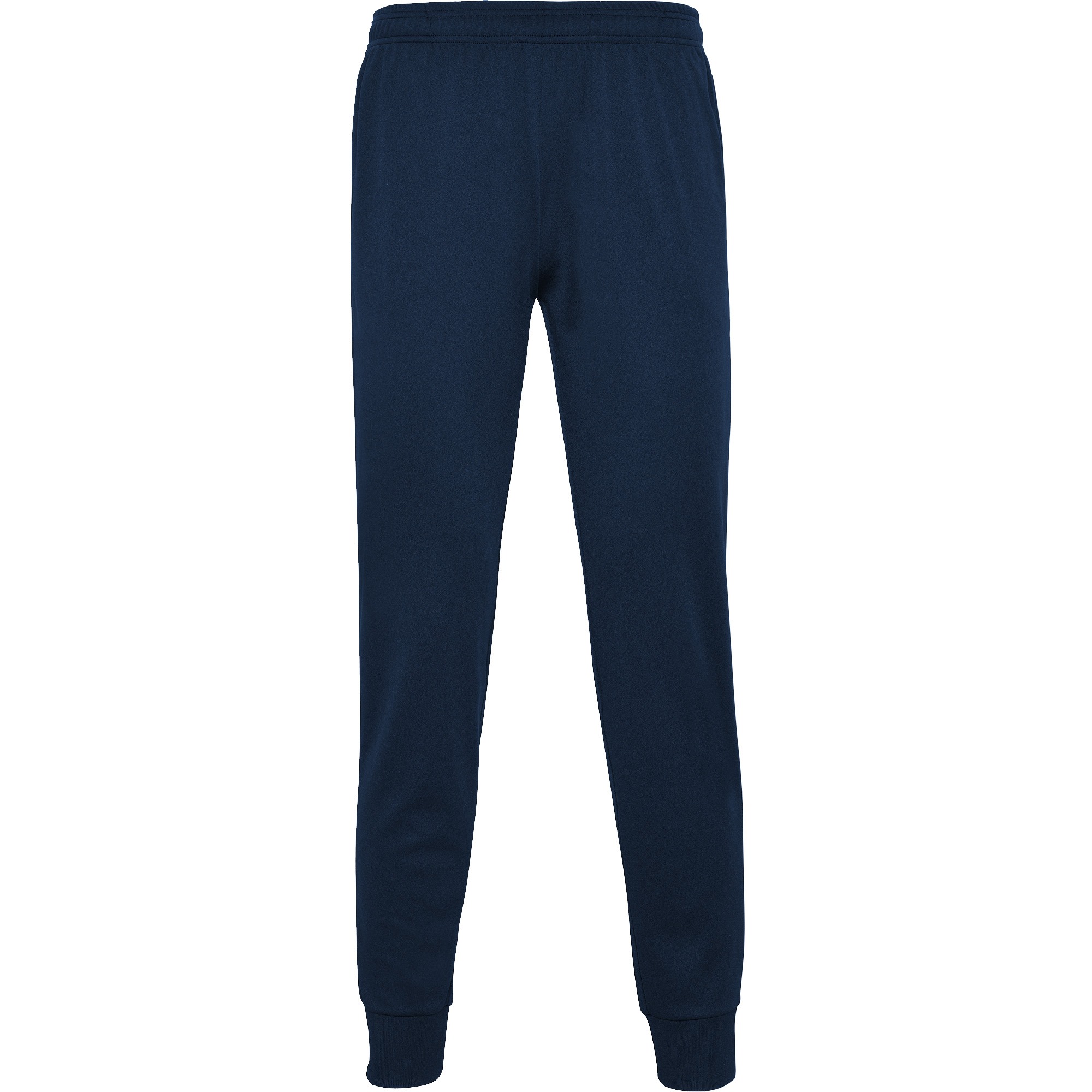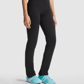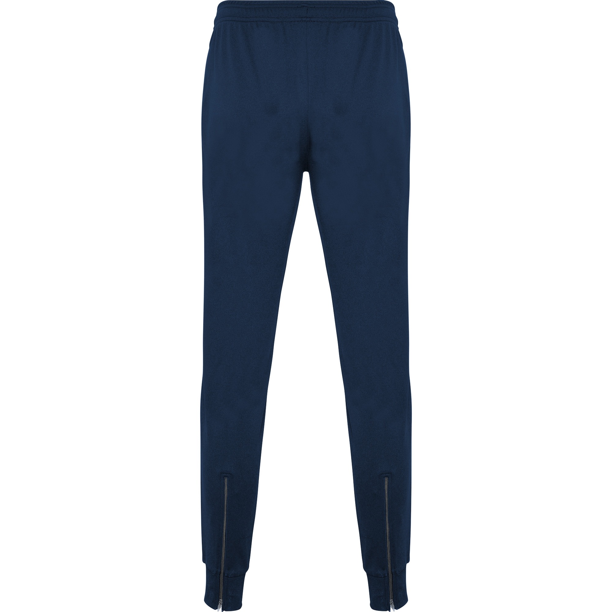 Pantalone aderente da allenamento. Girovita elasticizzato con cordoncino interno regolabile. Tasche laterali con zip in taglie da adulto. Polsini a coste 1×1 e zip.