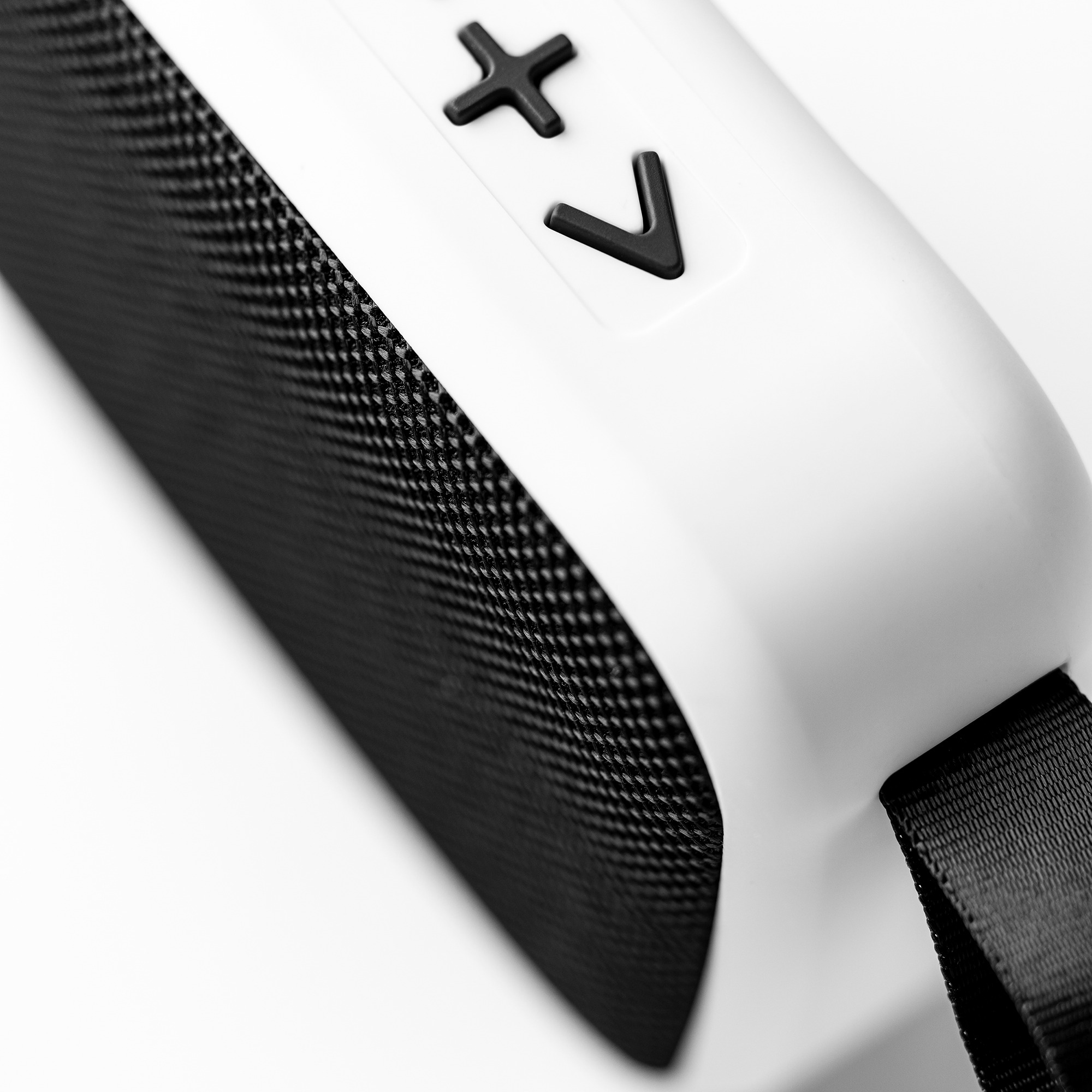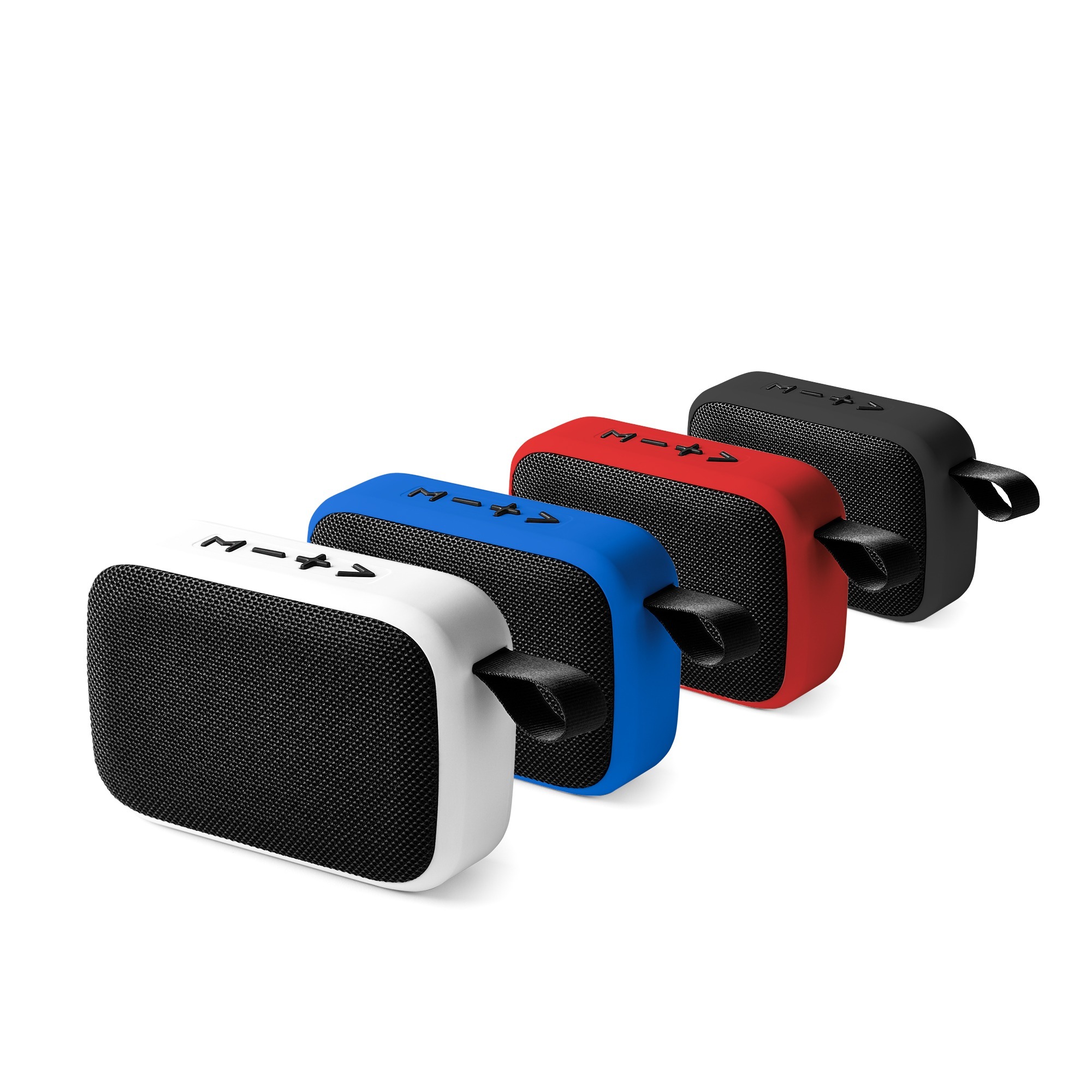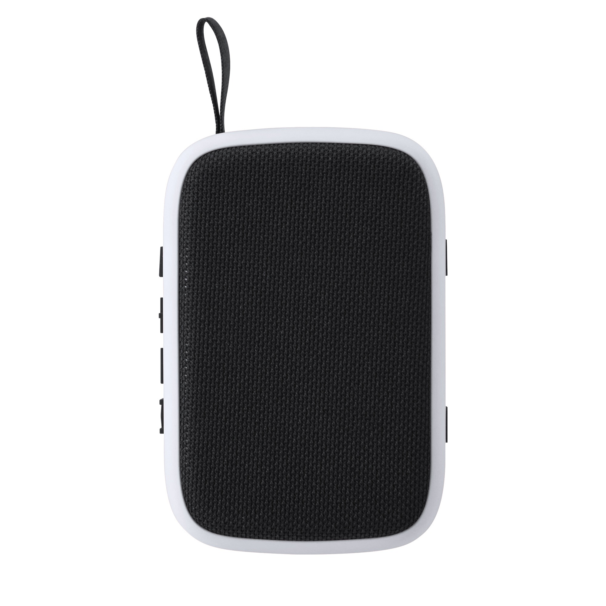 Cassa wireless bicolore con Bluetooth. Corpo con finitura touch in gomma opaca. Il modello include un anello per il trasporto, bottoni e tessuto coordinato. Ha una potenza di 3W e batteria ricaricabile. Cavo incluso.