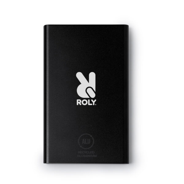 Batteria esterna Roly in alluminio riciclato. Capacità 4000 mAh. Dispone di un indicatore luminoso di carica. Porta di uscita USB e porta di ingresso/uscita di tipo C. Include un cavo di tipo C.