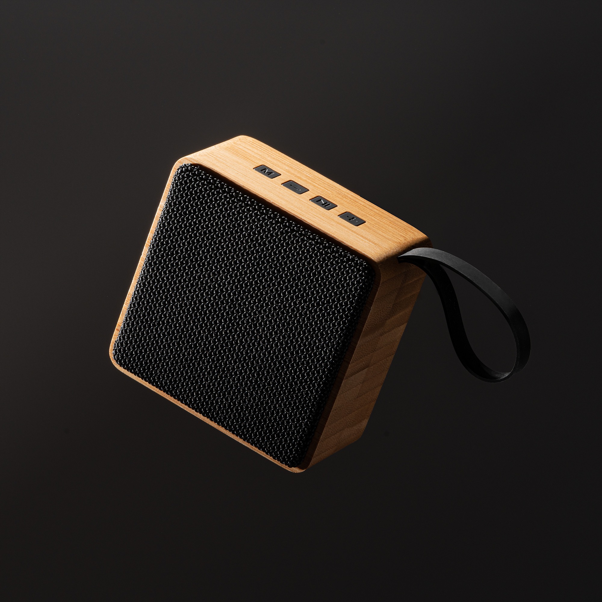 Cassa wireless con struttura principale in bambù e tessuto RPET. Uscita da 3W e batteria ricaricabile. Connessione di tipo C. Cavo incluso. Confezione in scatola dal design ecologico.