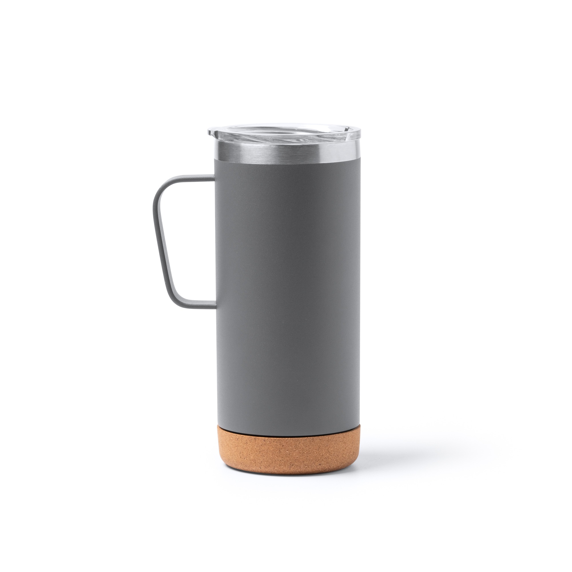 Tazza in acciaio inox a doppia parete con fondo in sughero e coperchio di sicurezza trasparente. Capacità 600 ml.