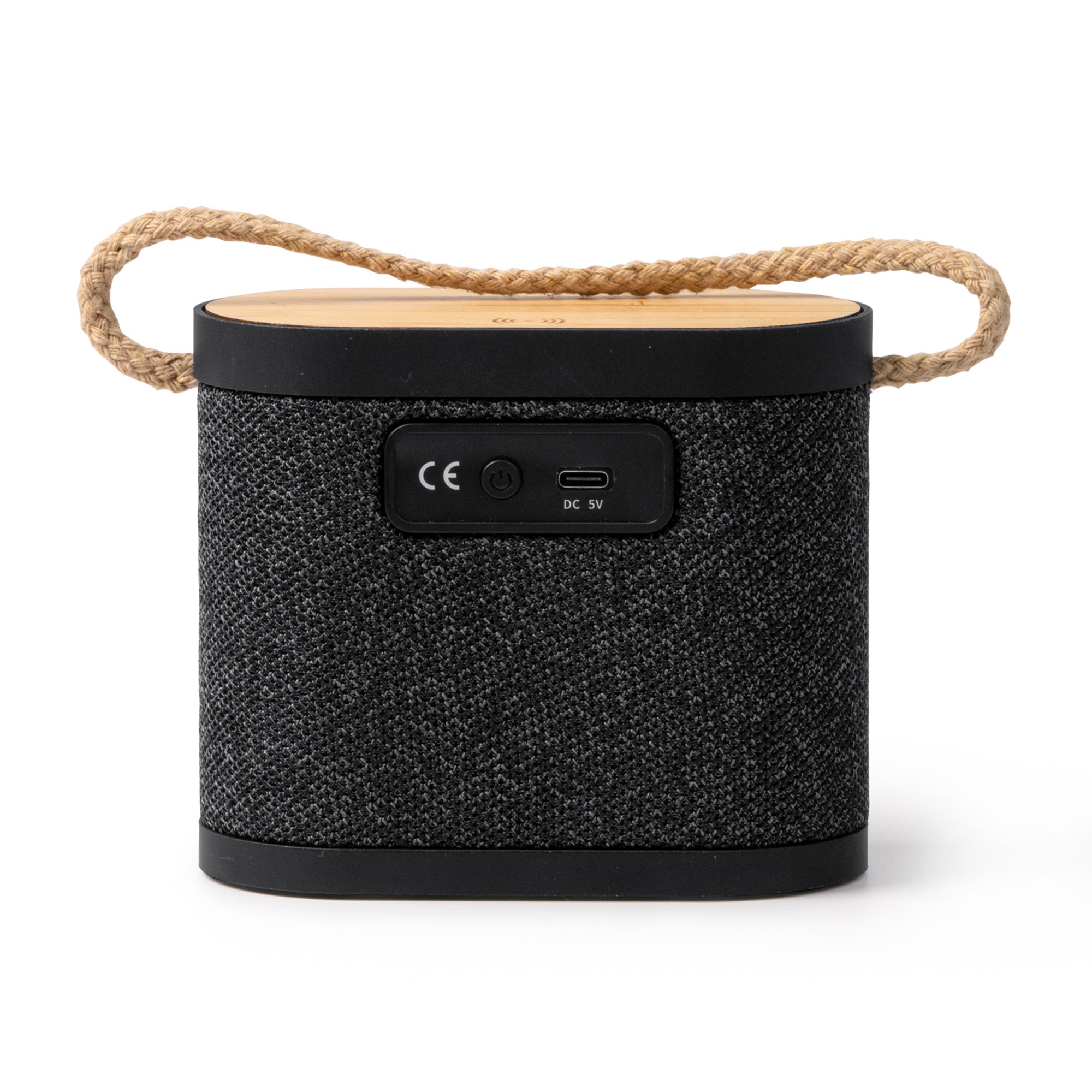 Altoparlante wireless con corpo in bambù e poliestere riciclato RPET, che offre una potenza di 5W. Include un caricatore wireless da 15 W per una maggiore comodità. È dotato di una comoda maniglia in cotone per il trasporto e di connessione Type-C. Il cavo è incluso. L’intero set viene fornito in una scatola ecologica, perfetta per chi cerca sostenibilità e stile in un unico prodotto.
