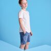 T-shirt a maniche corte con cuciture laterali. Cotone pettinato. Girocollo a coste 1×1 (4 strati). Scollo nastrato in tessuto coordinato.
