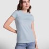 T-shirt aderente a maniche corte con vita affusolata. Girocollo a coste 1×1. Scollo nastrato in tessuto coordinato.