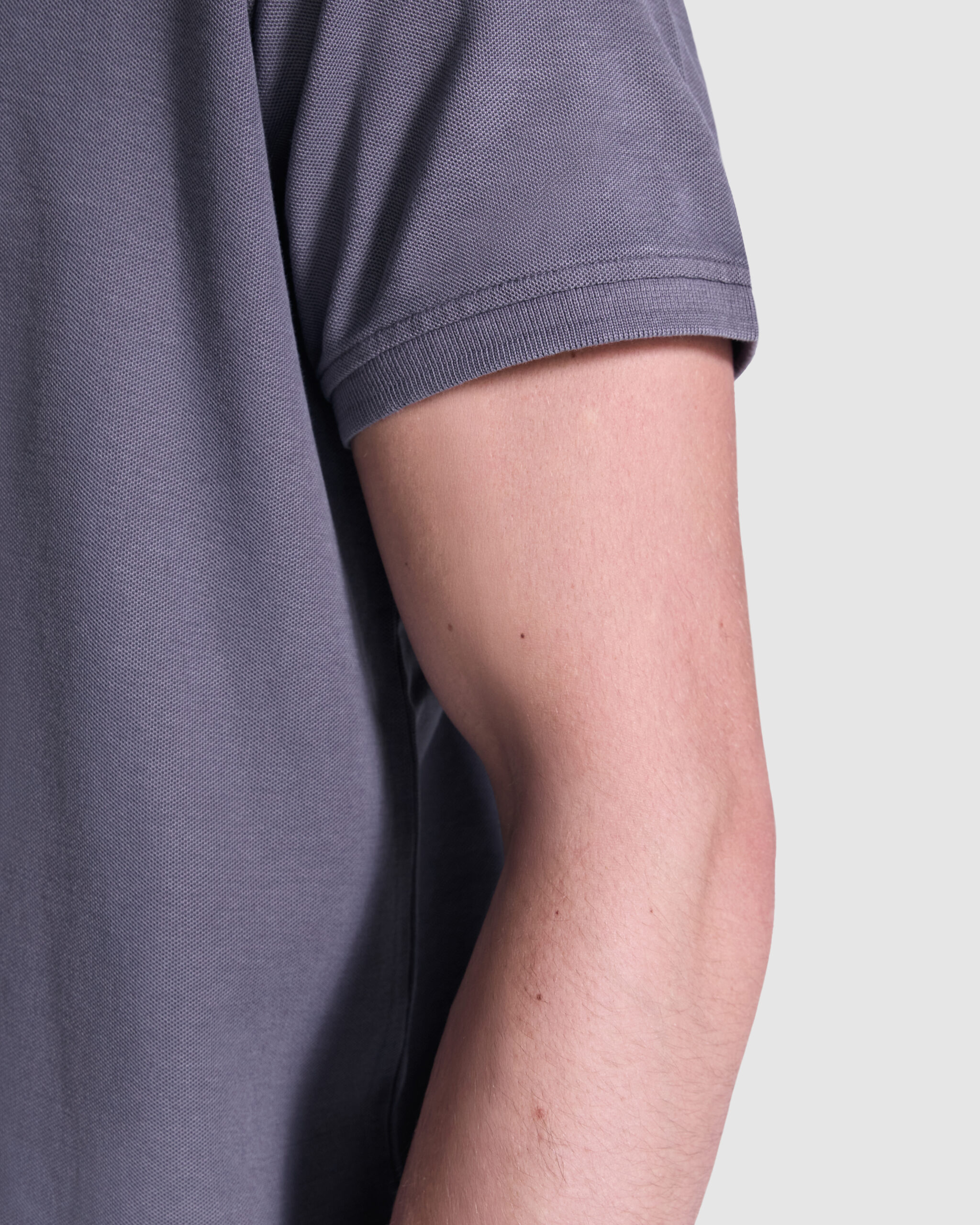 Polo in cotone a maniche corte. Punto piqué. Colletto e maniche intrecciati 1×1. Pattina a 3 bottoni. Scollo nastrato in tessuto coordinato. Spacchetti laterali sull’orlo.