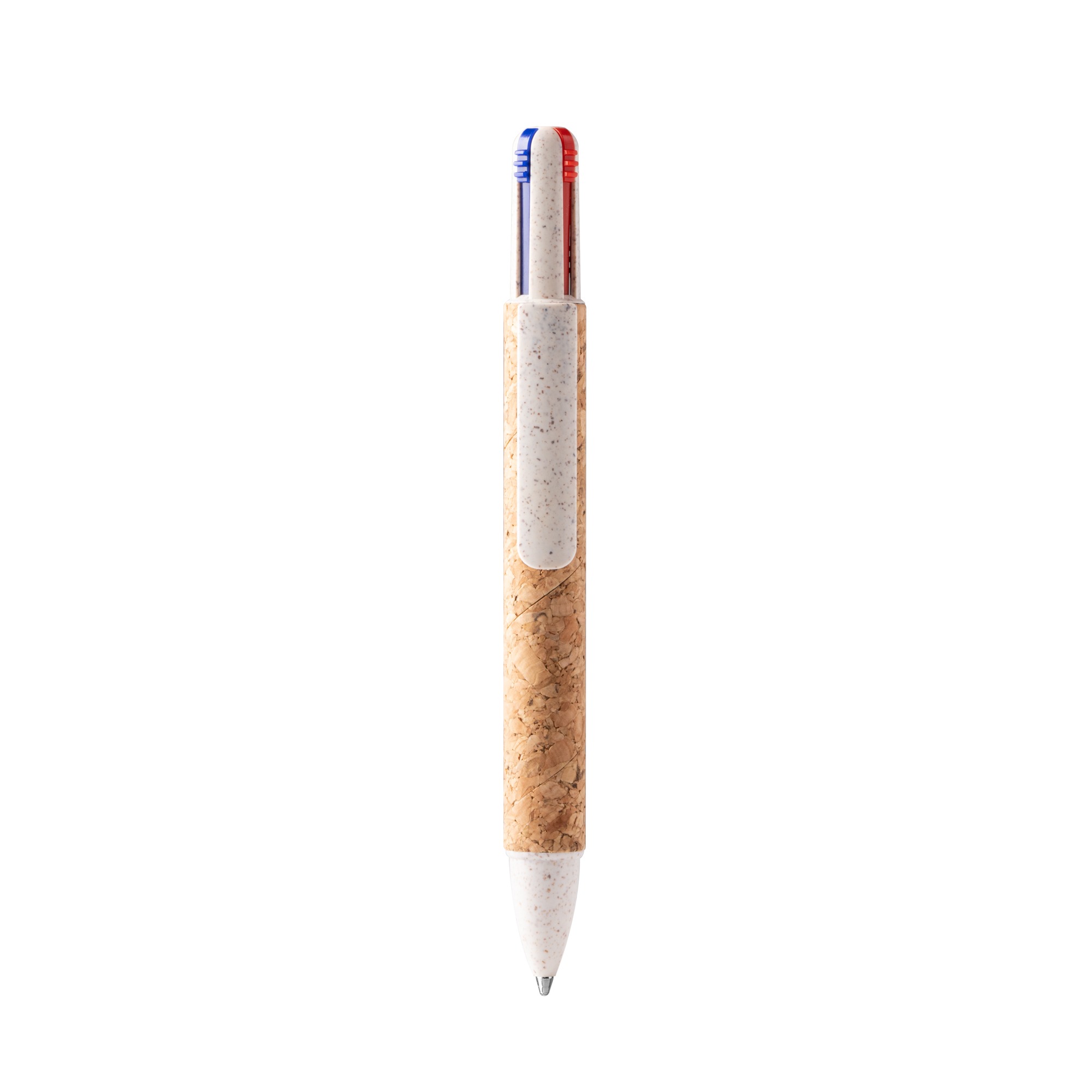 Penna a sfera retrattile a 3 inchiostri. Struttura in sughero e fibra di grano. Inchiostro blu, rosso e nero.