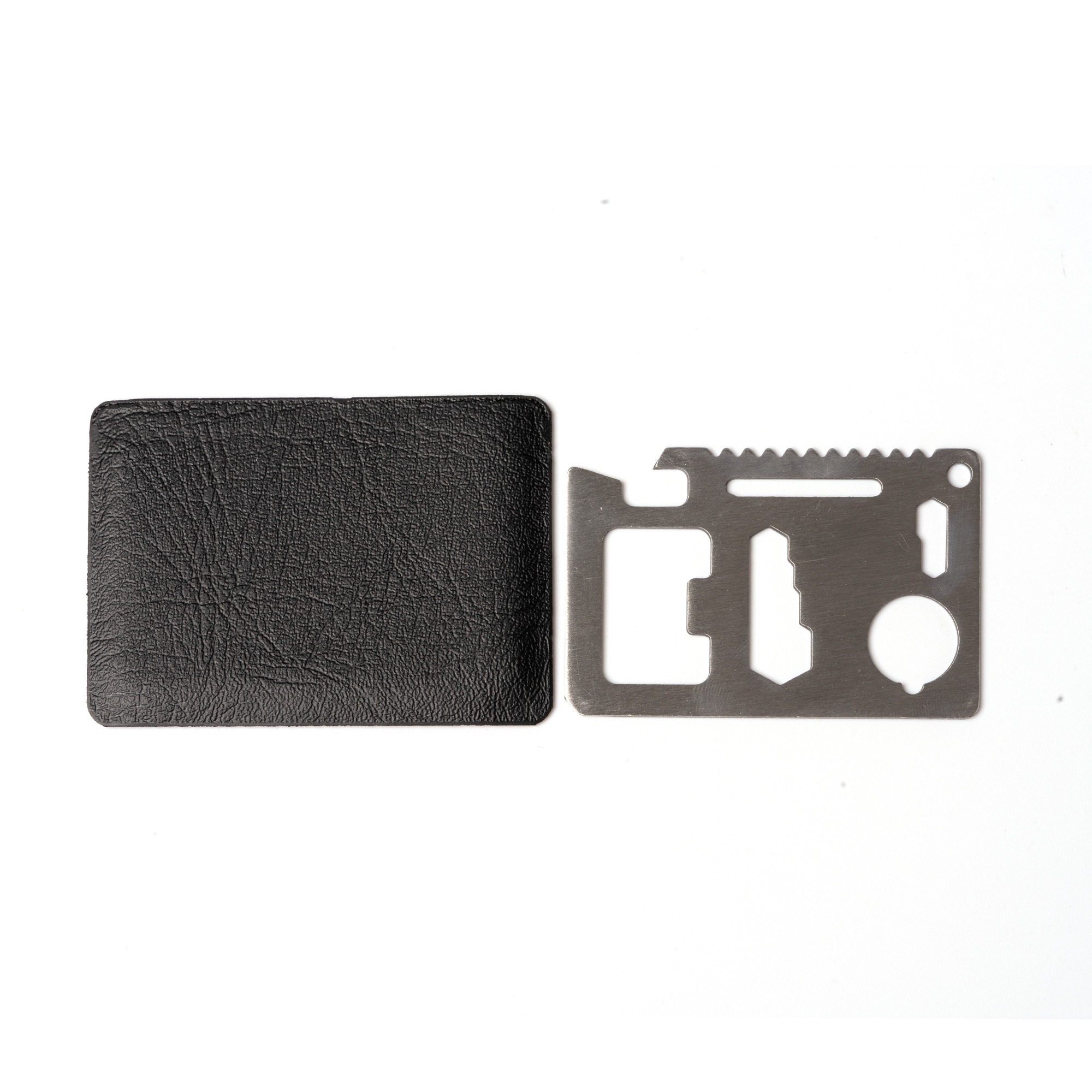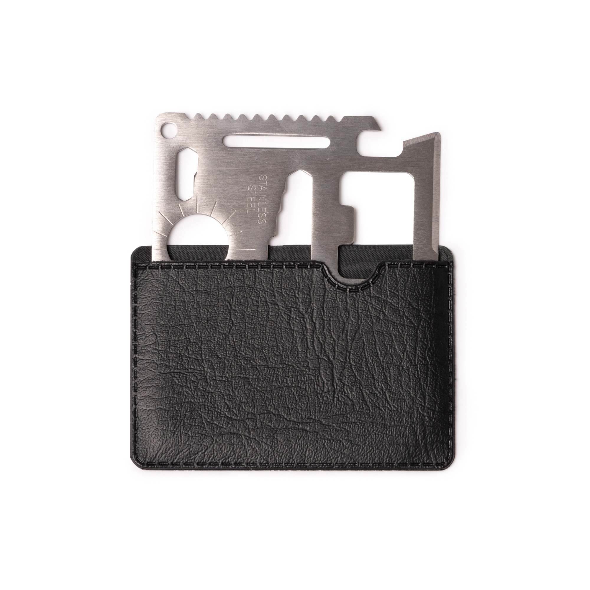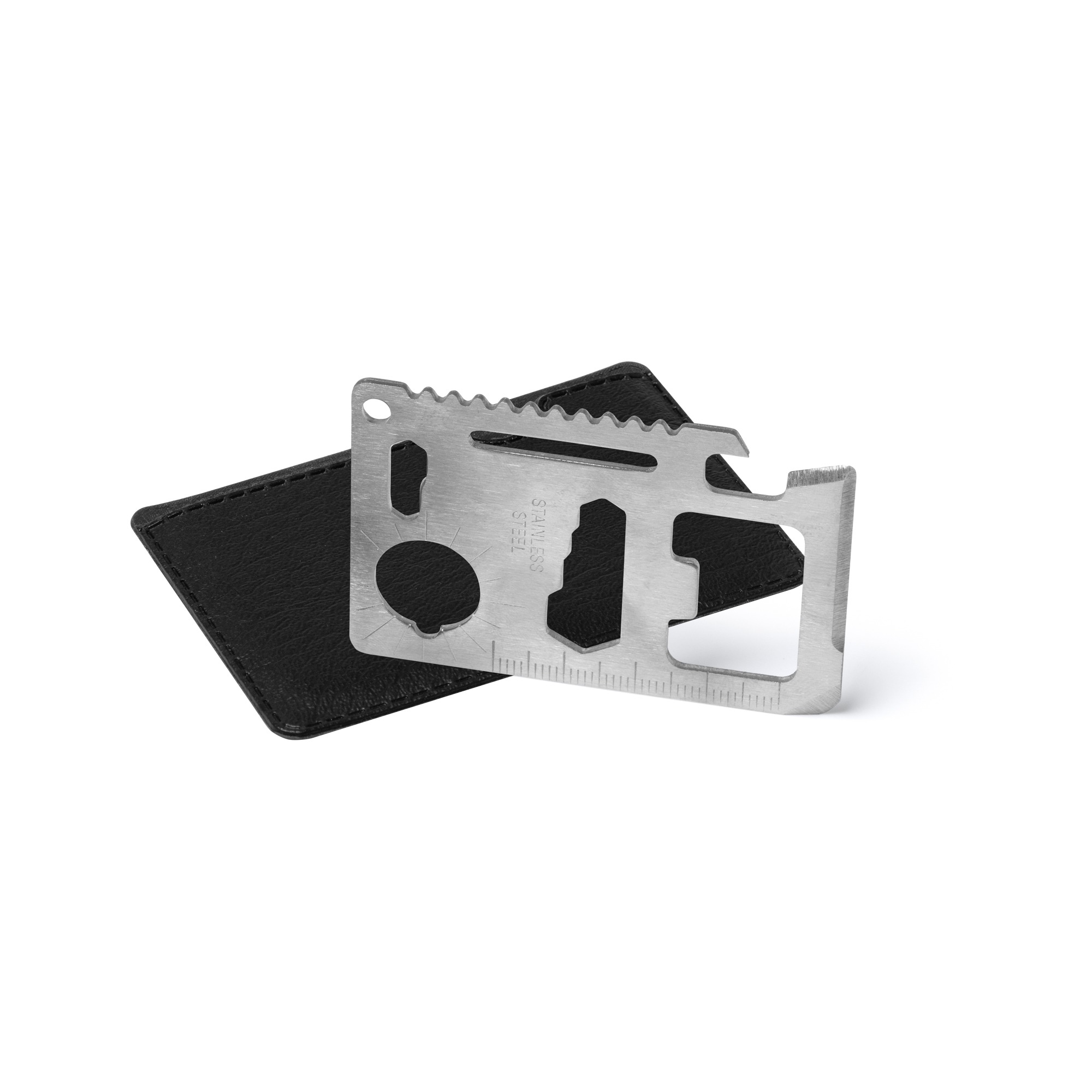 Utensile multifunzione in acciaio inox con 11 funzioni integrate. Strumento versatile che comprende: un apriscatole, un coltello affilato, un cacciavite, un righello, un apribottiglie, una chiave regolabile, una chiave a farfalla, una sega per piccoli lavori e un indicatore di direzione. Confezione in custodia PU.