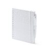 Quaderno A5 realizzato con estratti di pietra. Copertina rigida e doppie molle. Penna a sfera e portapenne abbinati. Inchiostro blu. 70 fogli a righe.