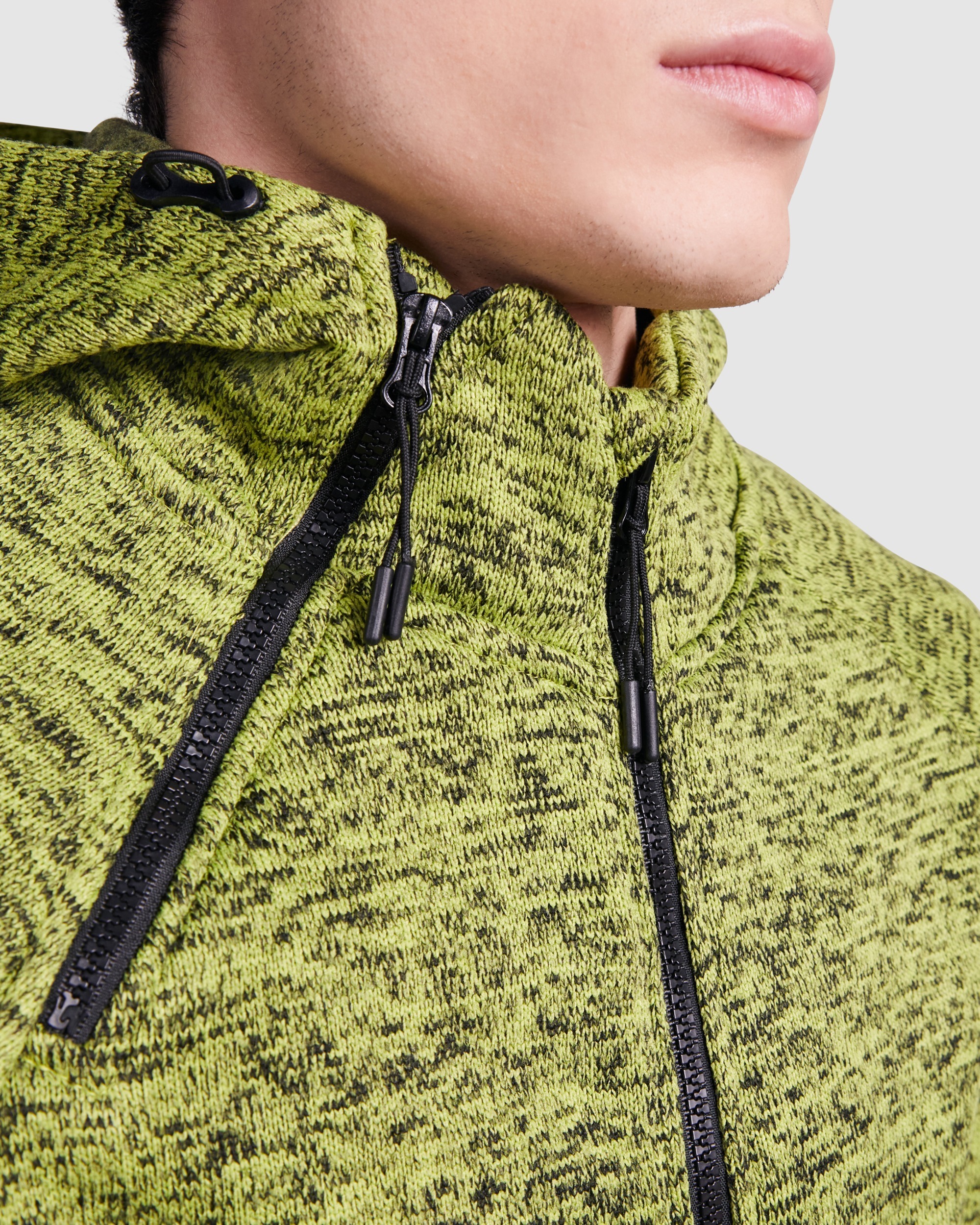 Felpa con cappuccio.Cerniere iniettate con tiretto di design, cerniera centrale con protetore per il mento e seconda cerniera decorativa sul collo per facilitare l’apertura. Collo alto con regolatori di design e copri cuciture interne. Due tasche frontali con cerniera.