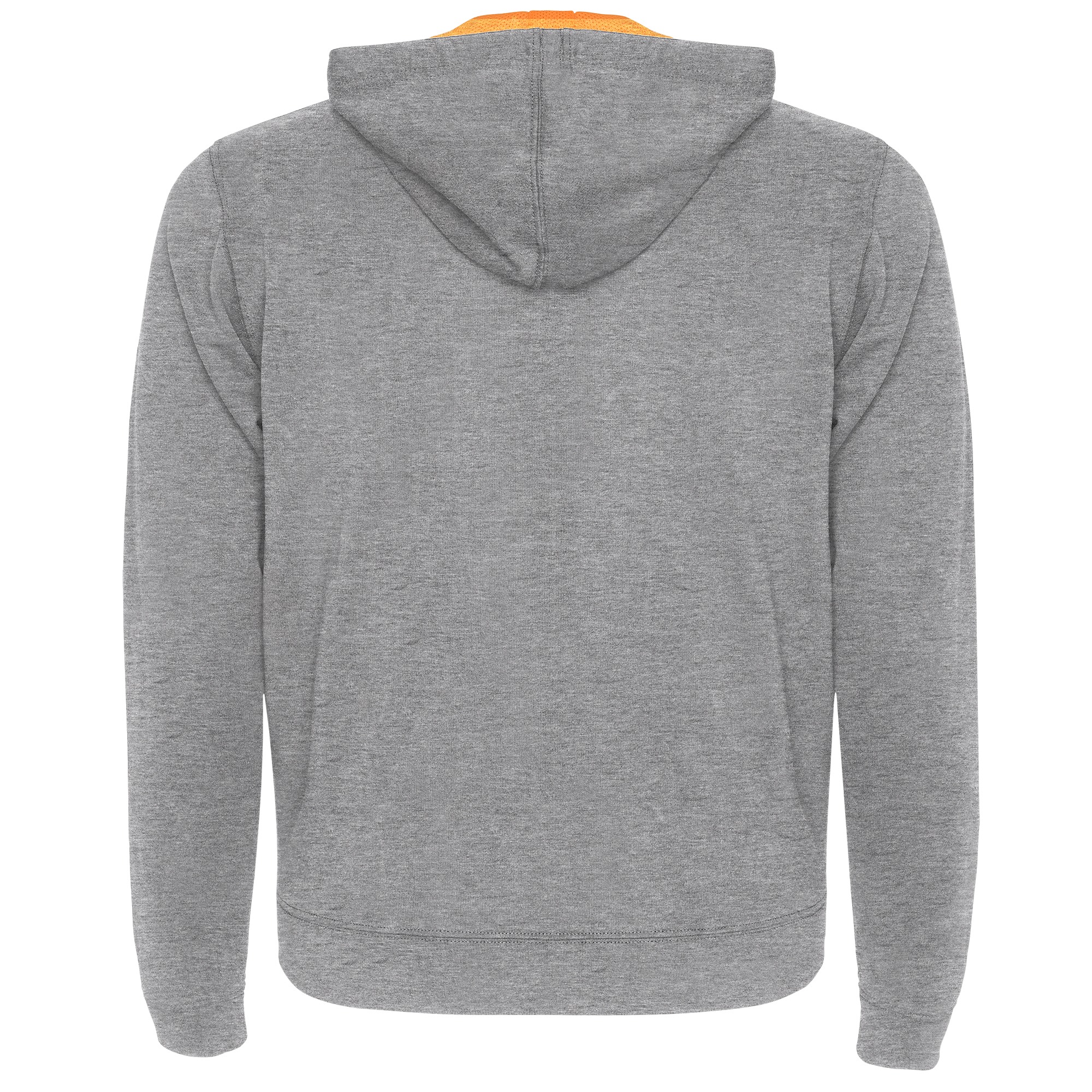 Felpa con cerniera frontale e cappuccio non garzato. Cappuccio foderato in rete di poliestere. Lacci piatti in poliestere. Polsini e cintura a coste 2×1 con elastan. Cuciture nastrate in tessuto coordinato. Opzioni di colore a tinta unita e a contrasto.
