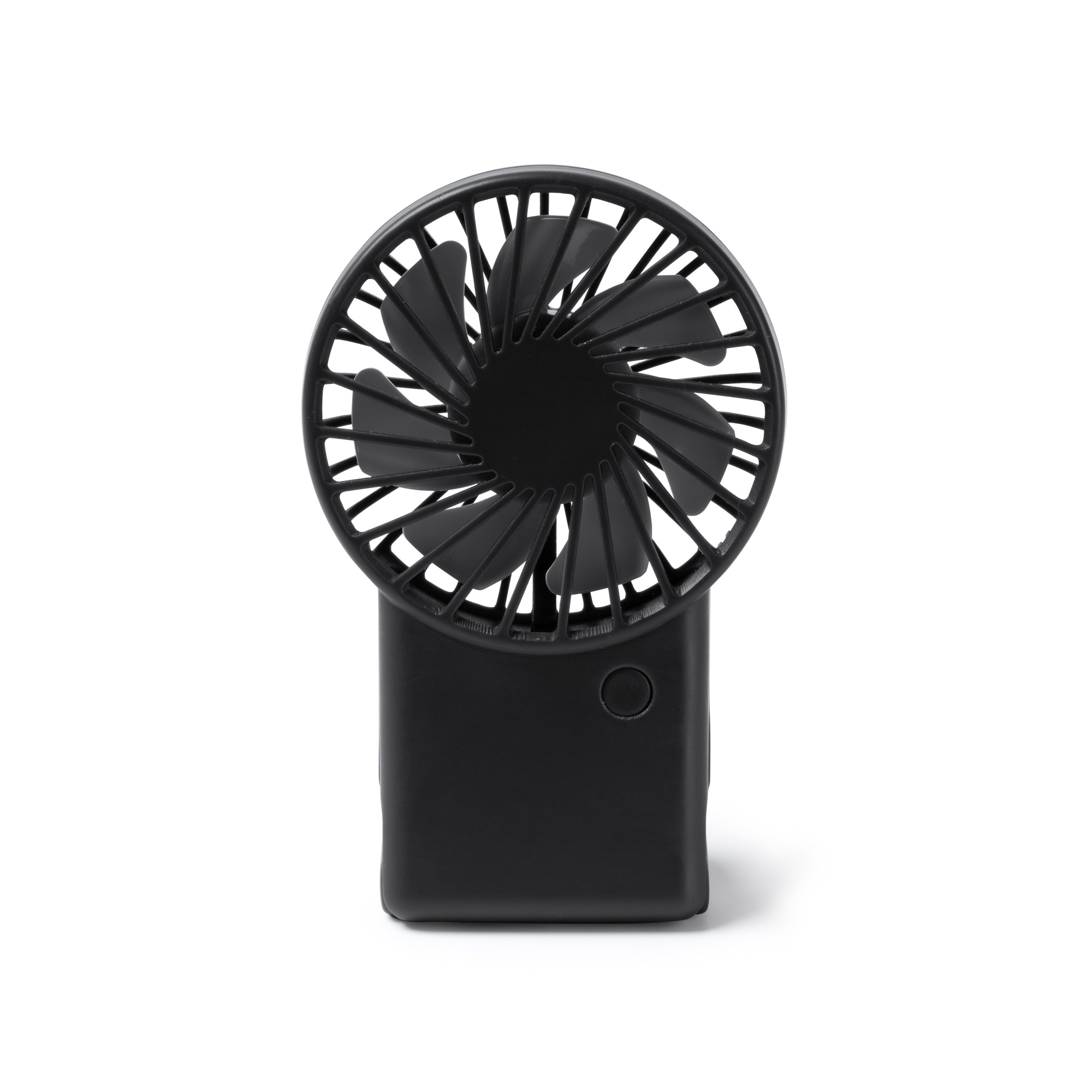 Ventilatore portatile con moschettone e supporto. Tre velocità. Realizzato in ABS riciclato. Include cavo di tipo C. Confezione in scatola con design ecologico