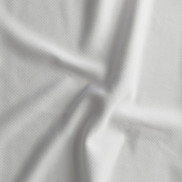 Tessuto in poliestere bianco, con una larghezza di 155 cm. Questo tessuto è ideale per abbigliamento tecnico e sportivo. Ha un disegno microforato su una delle sue facce. È un tessuto molto leggero nel movimento e nel drappeggio ed è molto facile da pulire. Resa di 6,90 m²/kg. Speciale per sublimazione e accetta serigrafia, transfer ed altre lavorazioni.