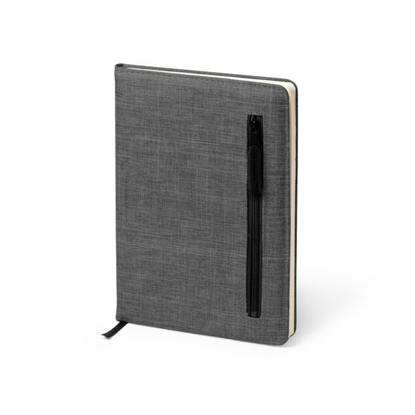 Quaderno A5 realizzato in RPET. Tasca esterna per accessori con chiusura a cerniera Include segnalibro. 80 fogli a righi.