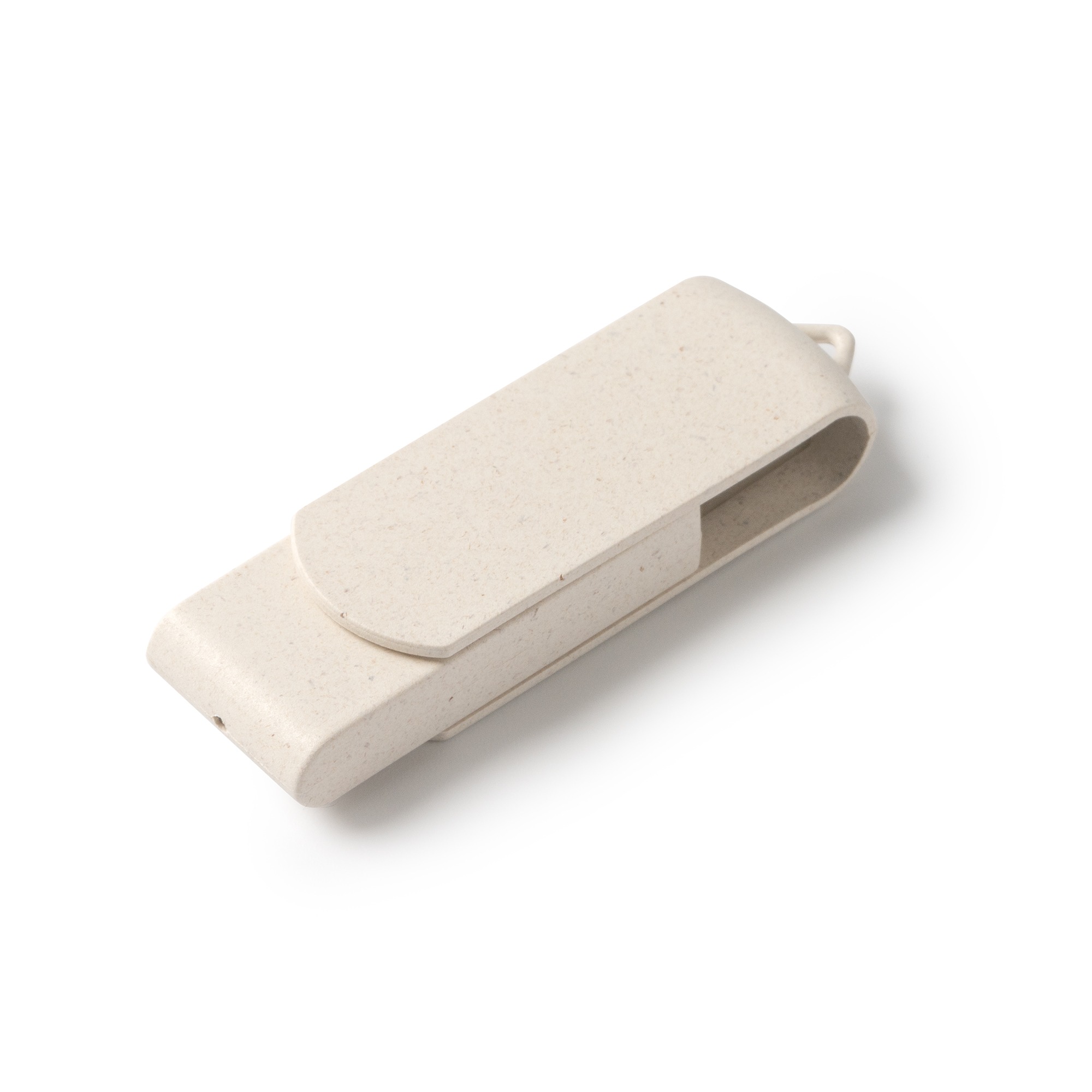 Chiavetta USB con struttura principale e clip girevole in fibra di grano. Confezione in scatola dal design ecologico.