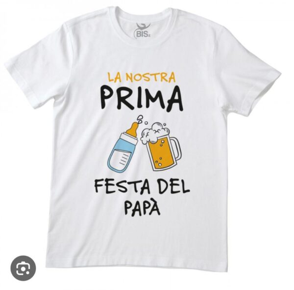 Questa maglietta potrebbe essere un bellissimo ricordo della “nostra prima festa del papà”, con un significato molto speciale. È un modo affettuoso per commemorare quel primo momento significativo in cui il legame tra papà e il nuovo membro della famiglia è stato celebrato. Potrebbe avere un design tenero e dolce, magari con un’immagine di papà insieme al bambino/a, o un disegno che rappresenti un momento speciale tra di loro. Il testo potrebbe essere elegante e semplice, mettendo in risalto la data o l’anno, creando così un pezzo unico e affettuoso per festeggiare il primo anniversario della festa del papà insieme al nuovo arrivato.