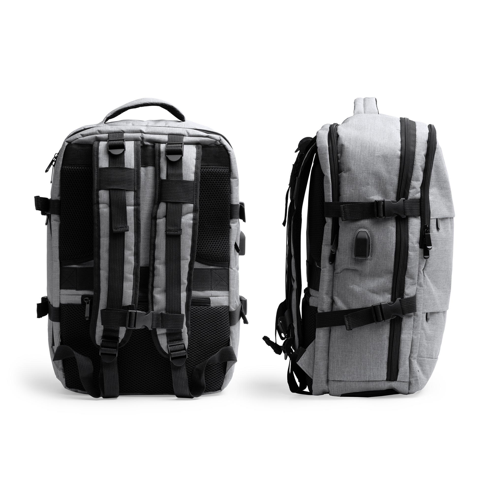 Zaino da viaggio in poliestere riciclato RPET, progettato per garantire comfort e funzionalità. Presenta schienale e maniglie imbottite, 2 tasche frontali esterne e 3 ampi scomparti principali. Include uno scomparto imbottito per laptop da 17,3”, una presa USB con cavo micro USB per collegare un Power Bank (non incluso) e uno scomparto traspirante per le scarpe. Con tasca antifurto sul retro e cinghia per trolley, offre una capacità di 30 litri per viaggi organizzati e sicuri.