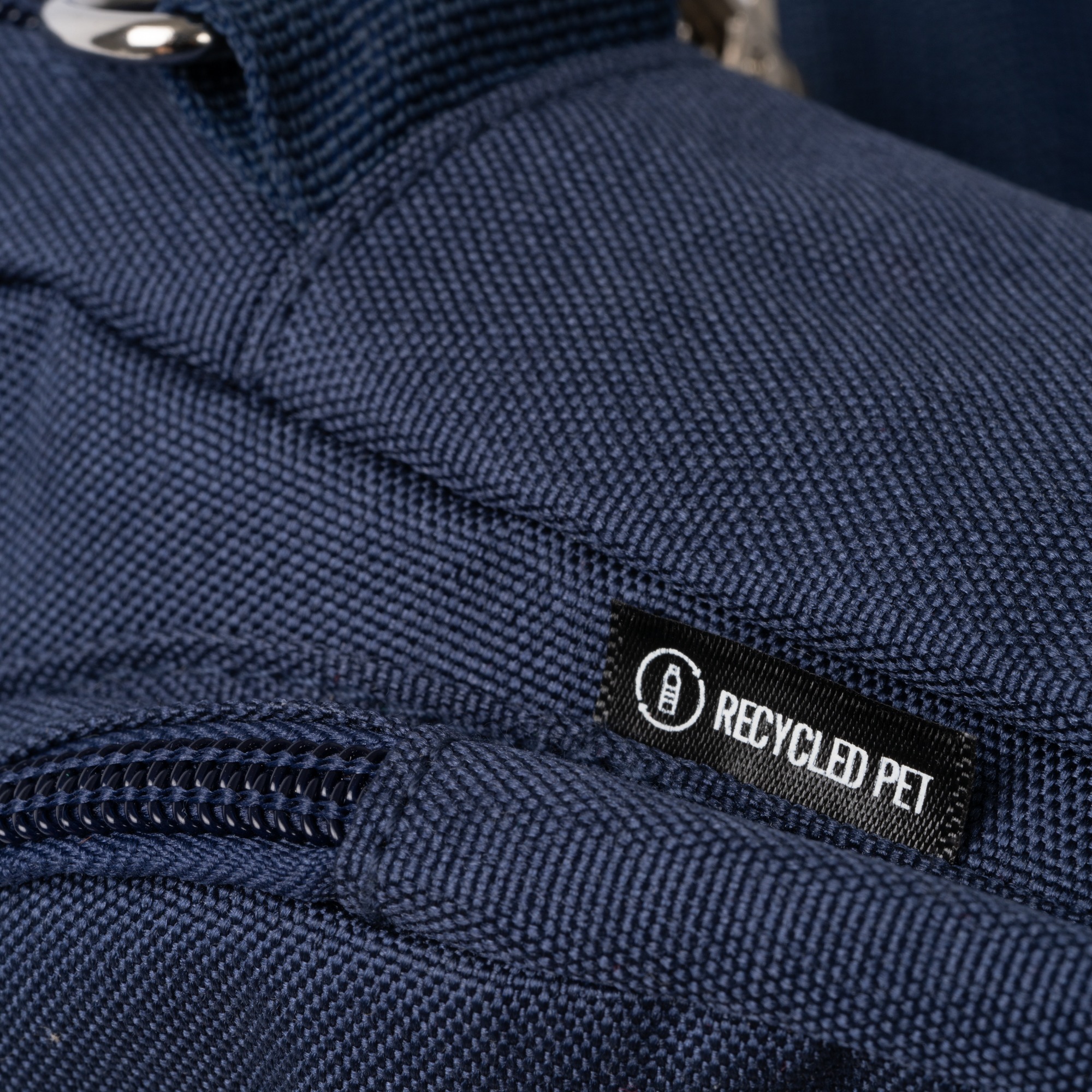 Borsello a tracolla in RPET 600D. Doppia tasca frontale con chiusura a zip e 2 tasche laterali. Manici e schienale imbottiti.