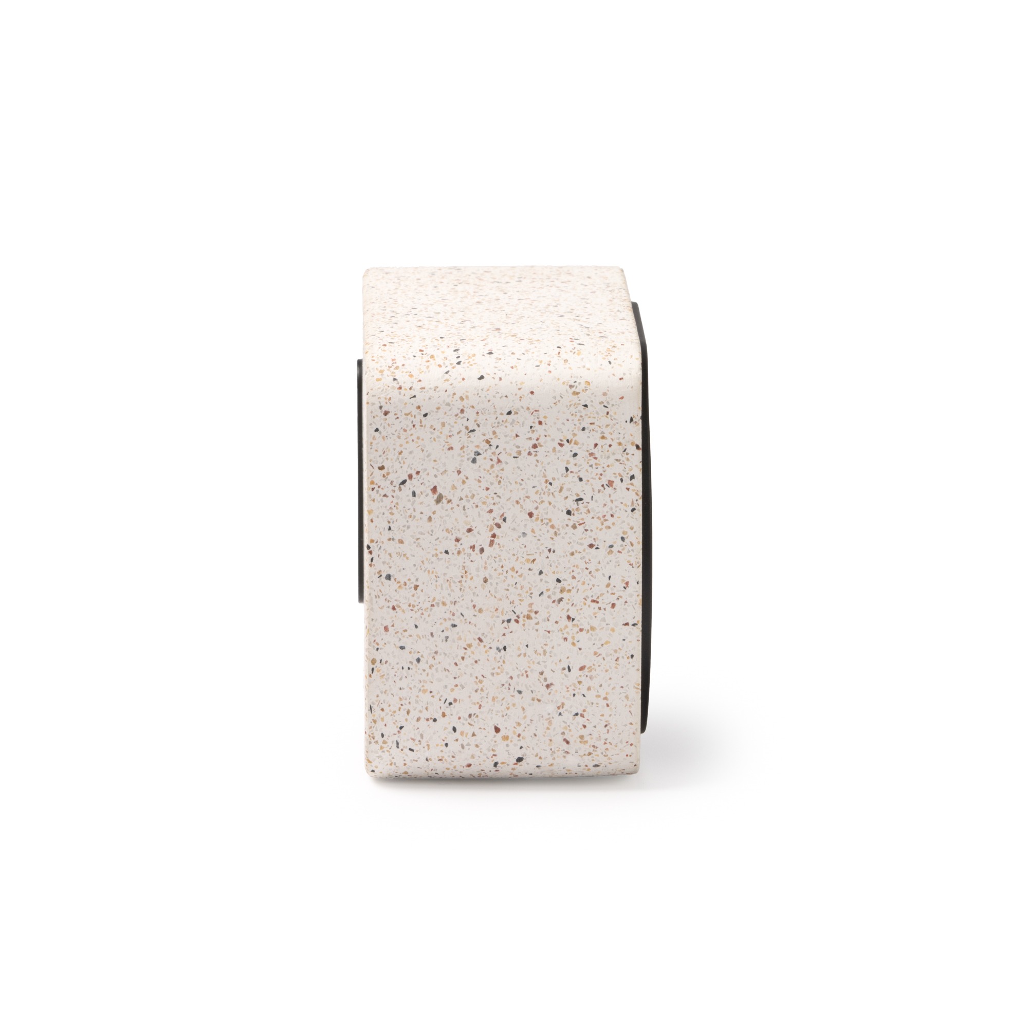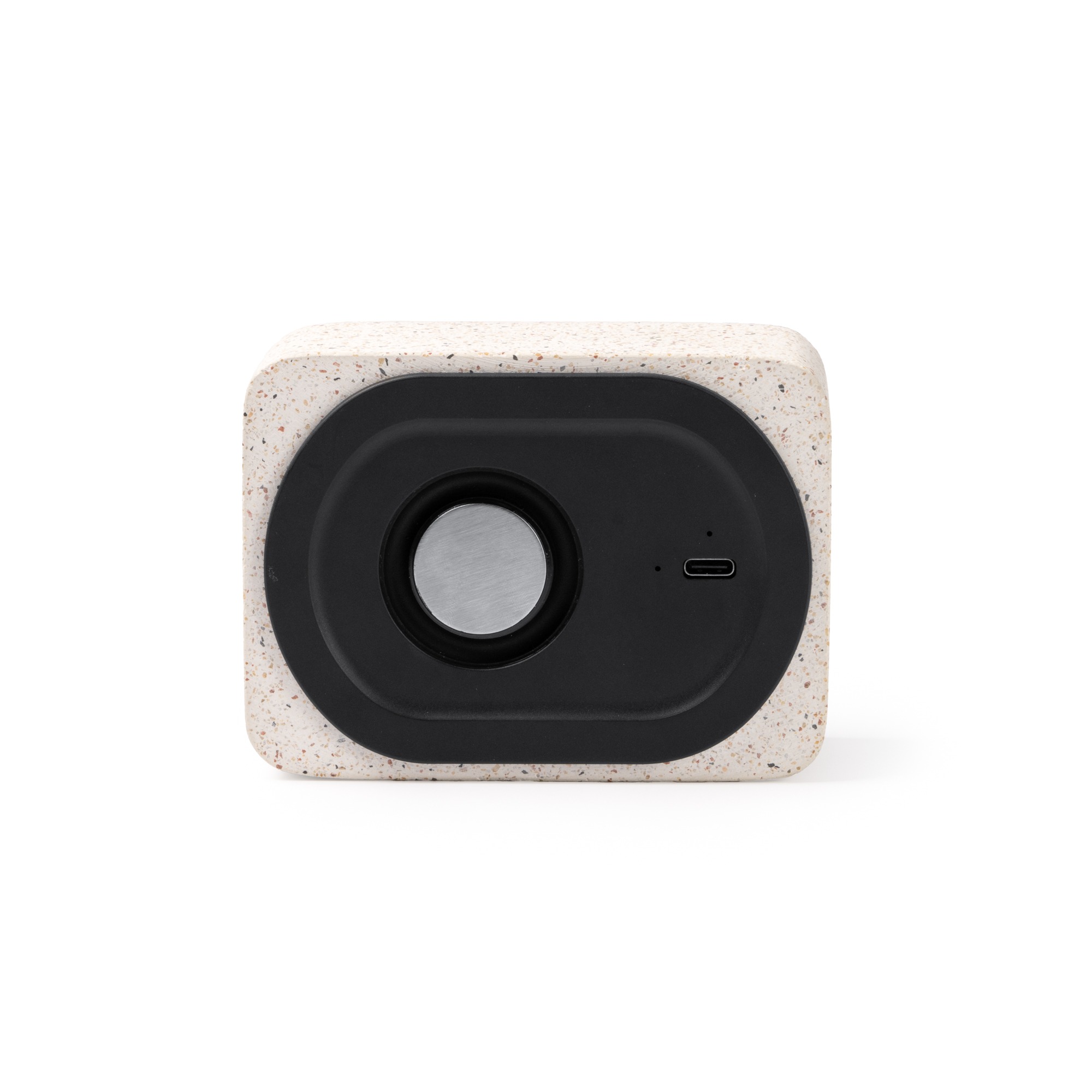 Altoparlante wireless con corpo in pietra di terrazzo riciclata e bambù. Potenza: 5W. Cavo di tipo C incluso. Confezione in scatola con design ecologico.