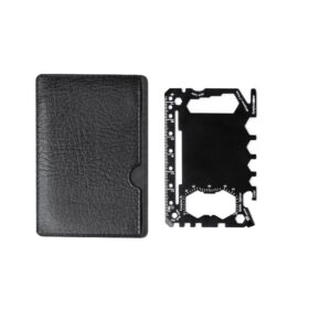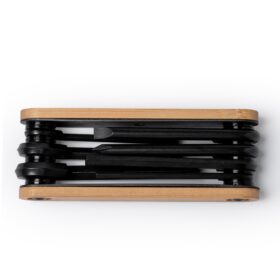 Utensile multiuso con corpo e accessori in acciaio inox e impugnatura in bambù. 12 funzioni: rasoio, sega, lima, apripista, cacciavite e pinze. Include tracolla per il trasporto.