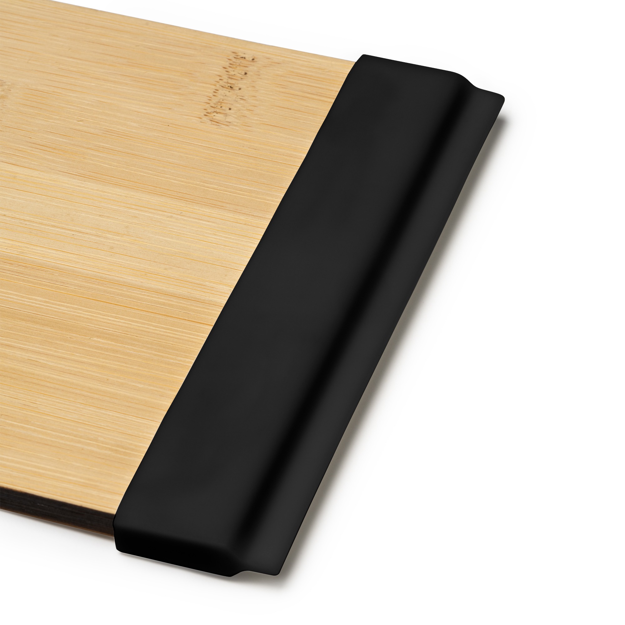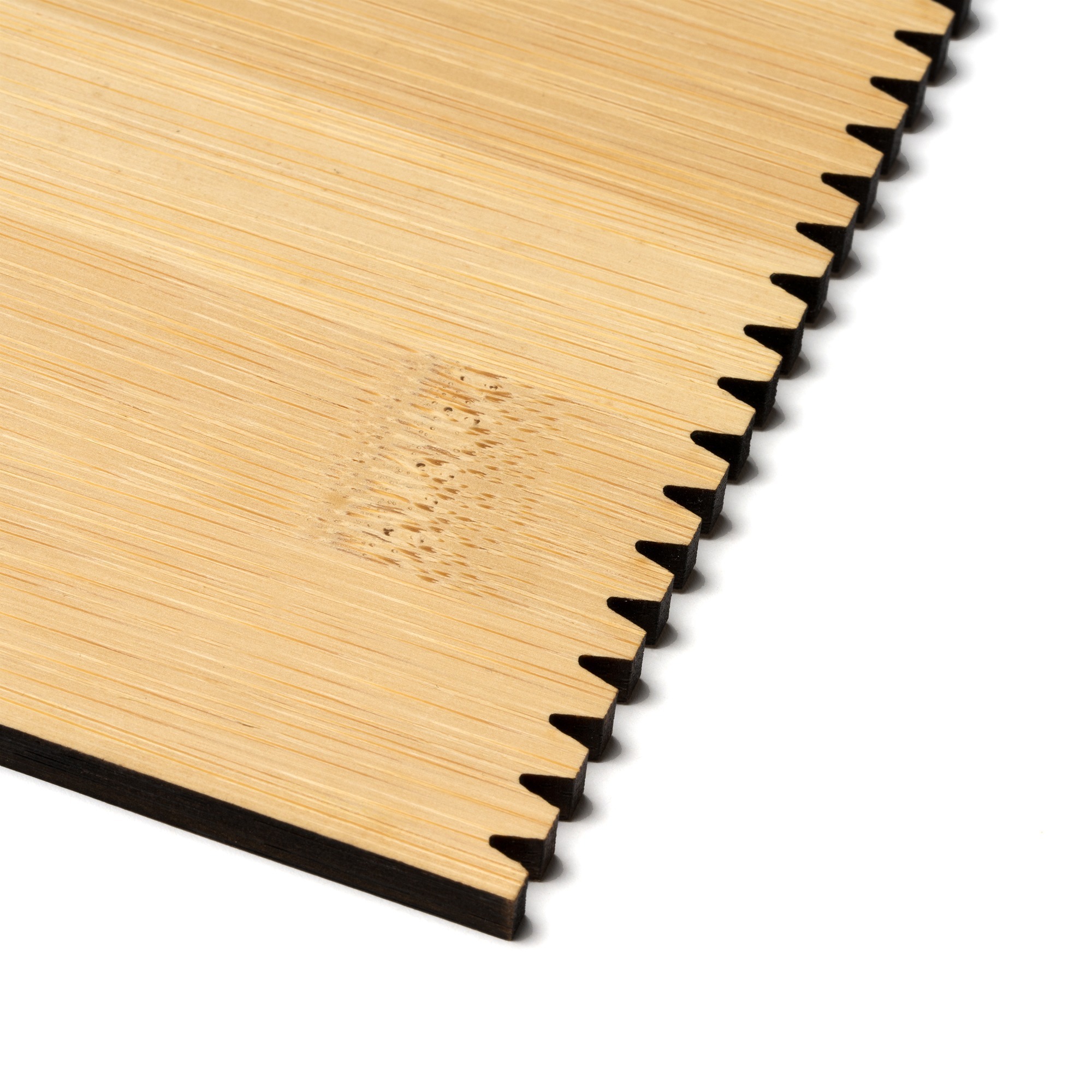 Raschietto per ghiaccio in bambù con un bordo seghettato e uno liscio.