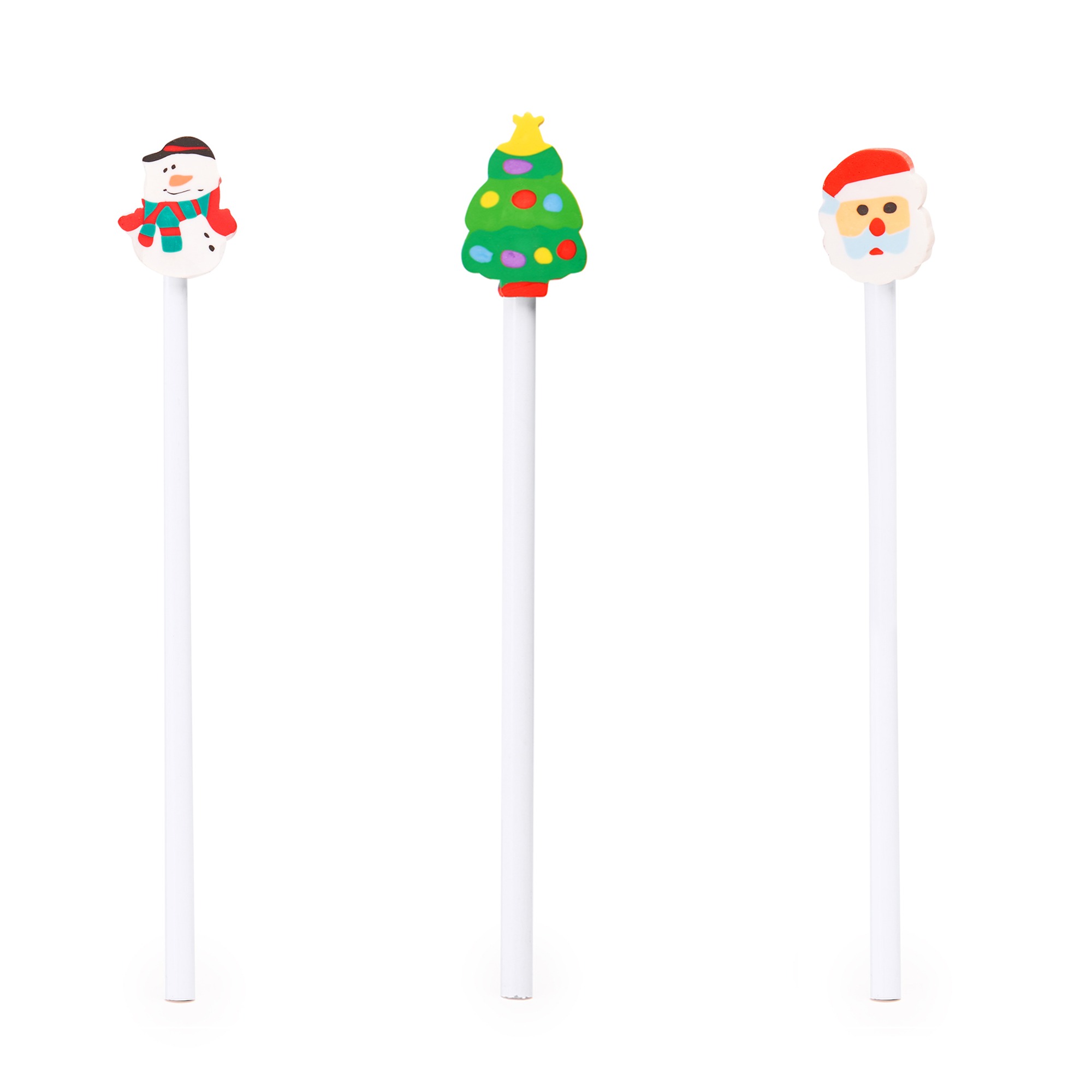 Matita bianca rotonda in legno con gomma disponibile in tre disegni natalizi: albero, Babbo Natale e pupazzo di neve.