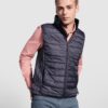 Gilet imbottito impermeabile. Zip frontale invertita tono su tono con protezione per il mento in tessuto uguale. Tasche laterali con zip tono su tono inserite nei pannelli laterali. Piping elastico invertito tono su tono su giromanica e orlo. Opzioni di fodera in tinta unita o a contrasto.
