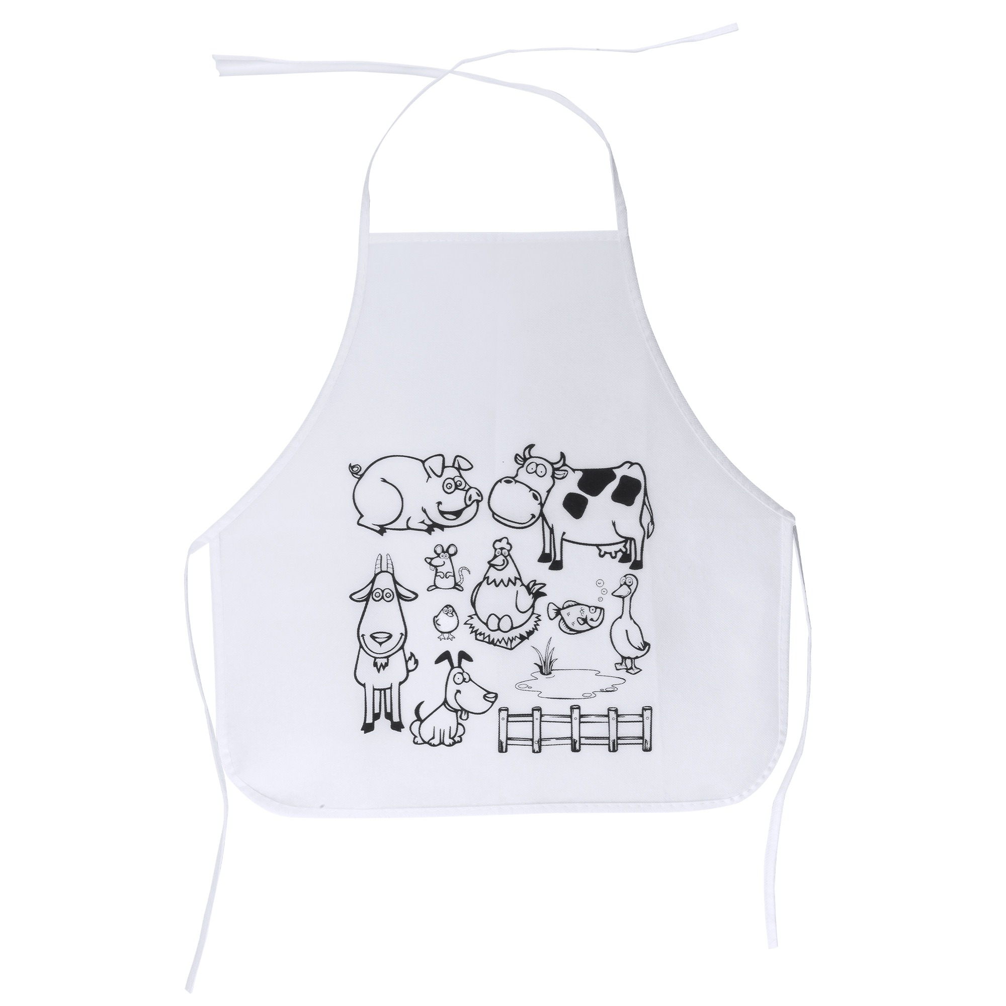 Grembiule in tessuto non-woven per bambini con disegno da colorare. Include 5 pastelli di vari colori. Taglia unica regolabile.