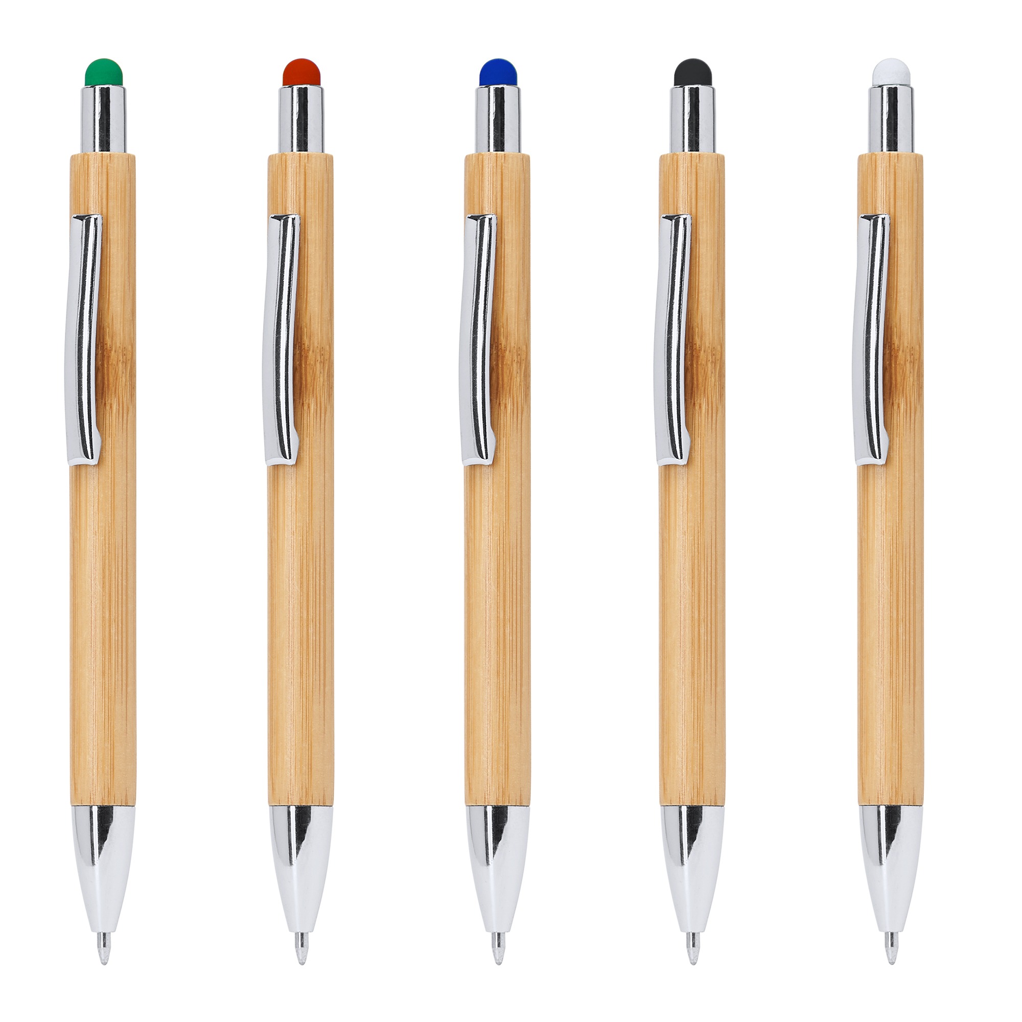 Penna della linea eco con corpo in bambù, puntatore tattile a colori e clip in metallo. Bottone, clip e punta argentati. Carica jumbo trasparente da 1,0 mm con inchiostro blu.