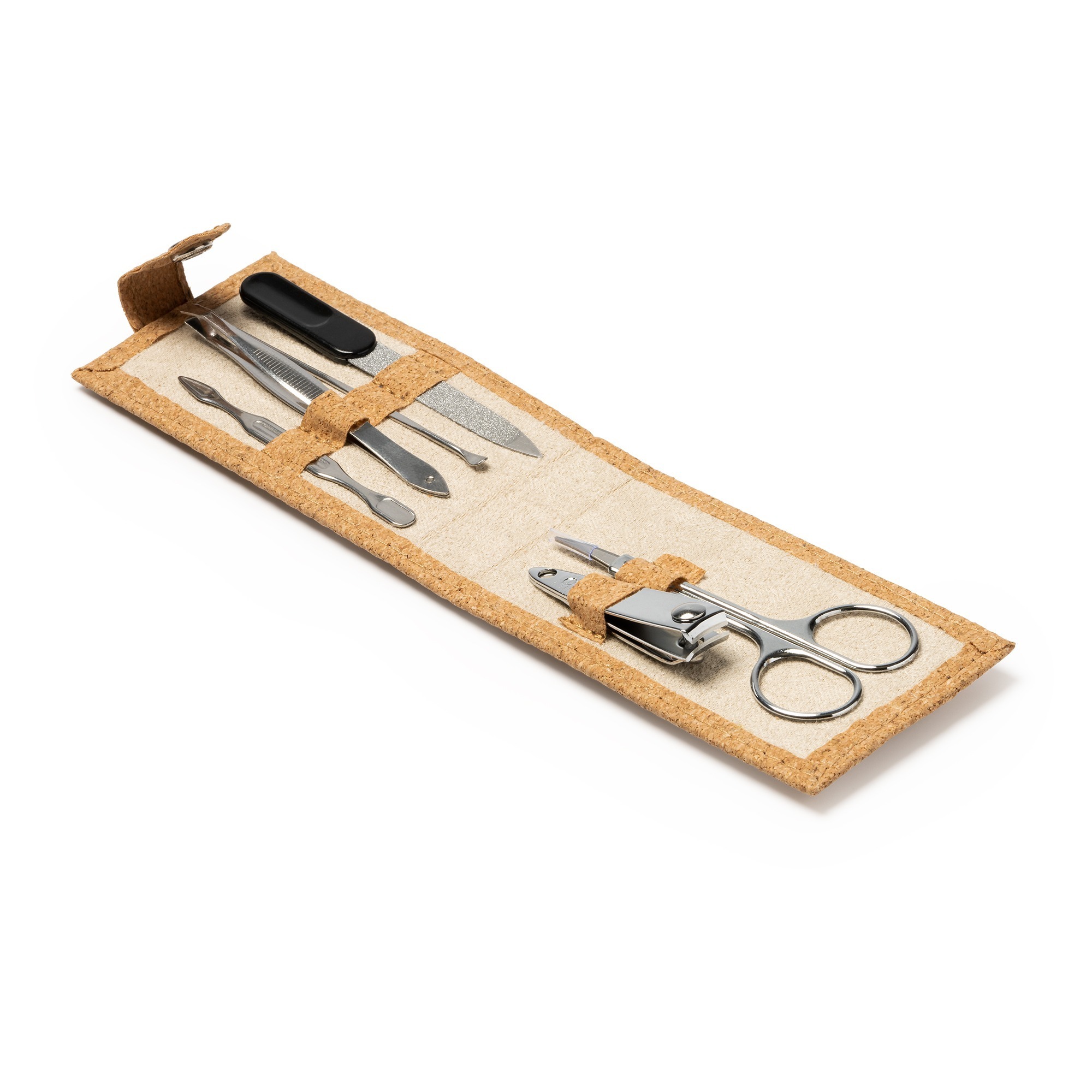 Kit per manicure con custodia in sughero e chiusura a scatto. Forbici, pinzette, tagliaunghie, lima e taglia cuticole in acciaio inox inclusi.
