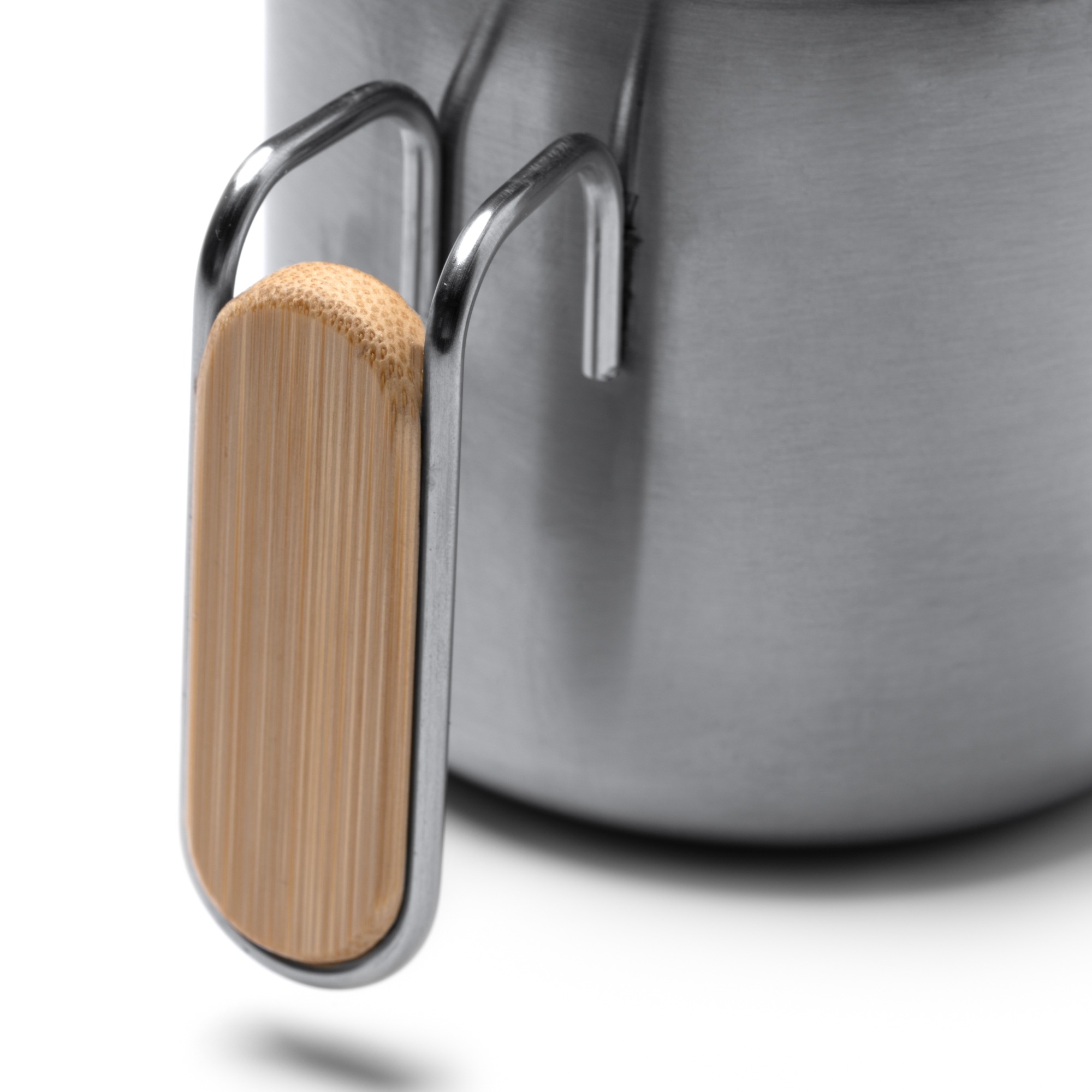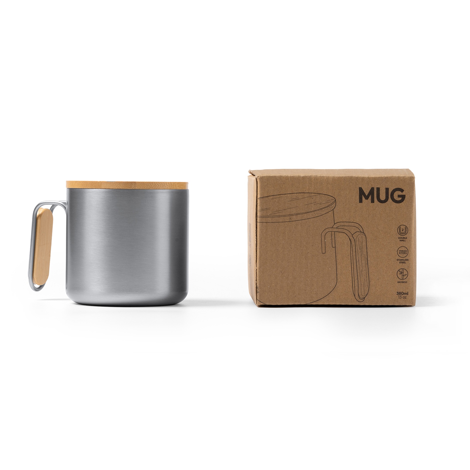 Tazza in acciaio inox 304 riciclato con dettaglio in bambù sul manico. Capacità 350 ml. Confezione in una scatola di design ecologico.