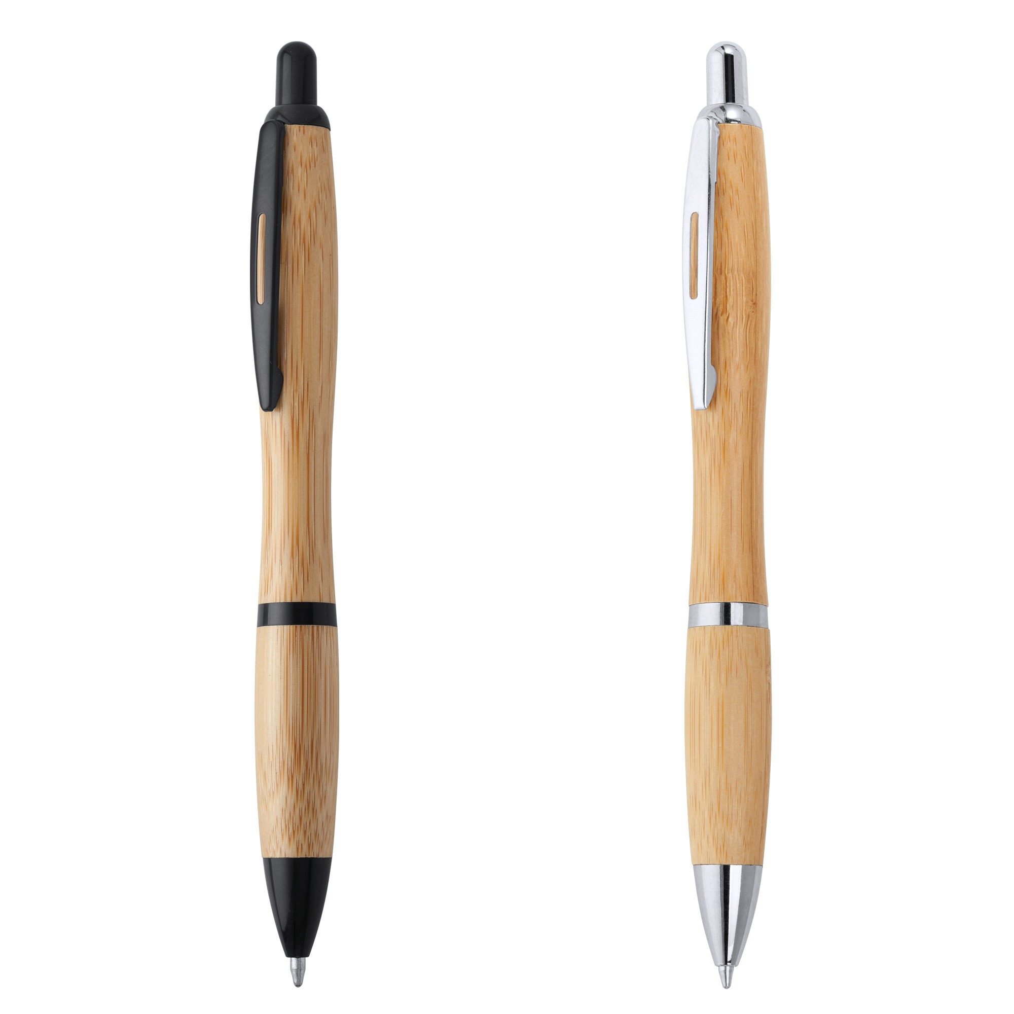 Penna con pulsante realizzata in bambú e con finitura metallizata. Ricarica di inchiostro blu Jumbo.
