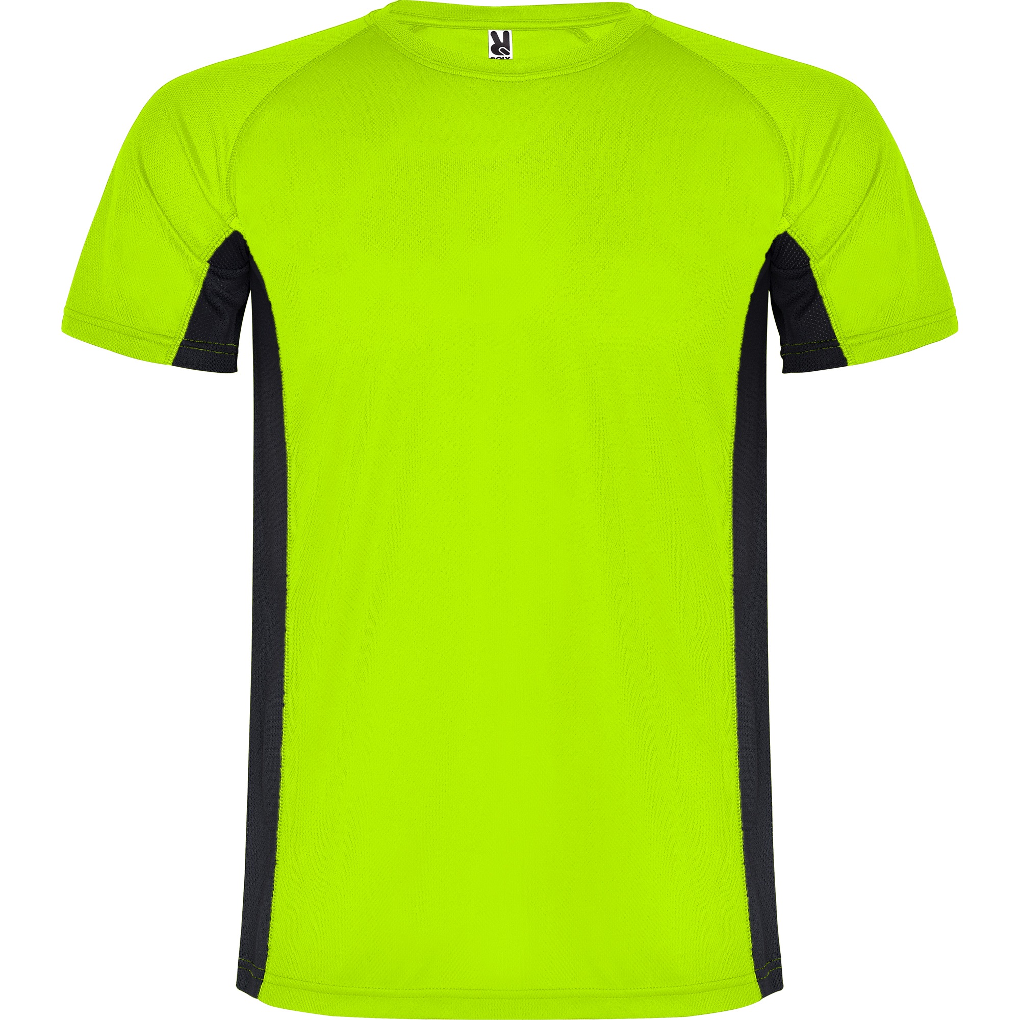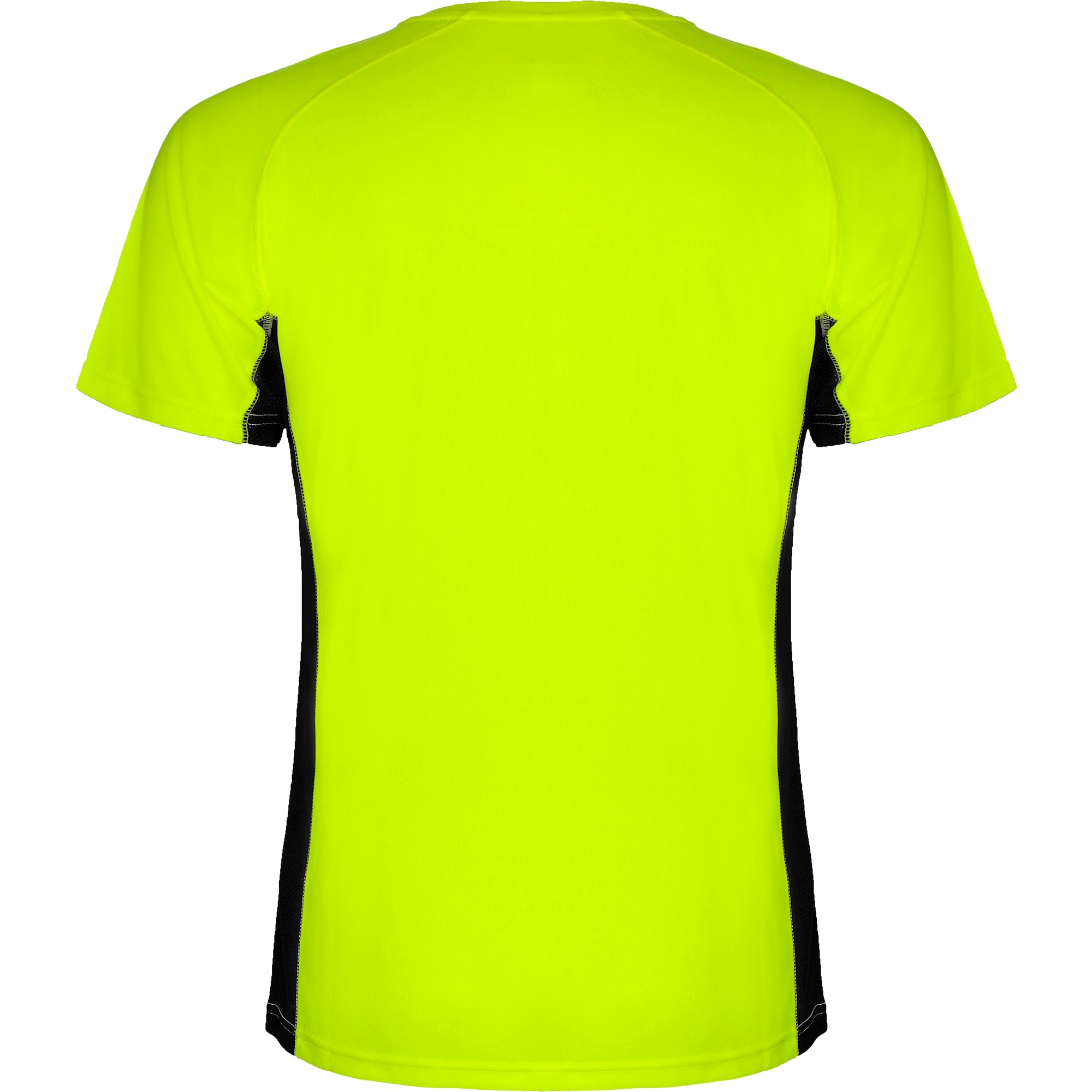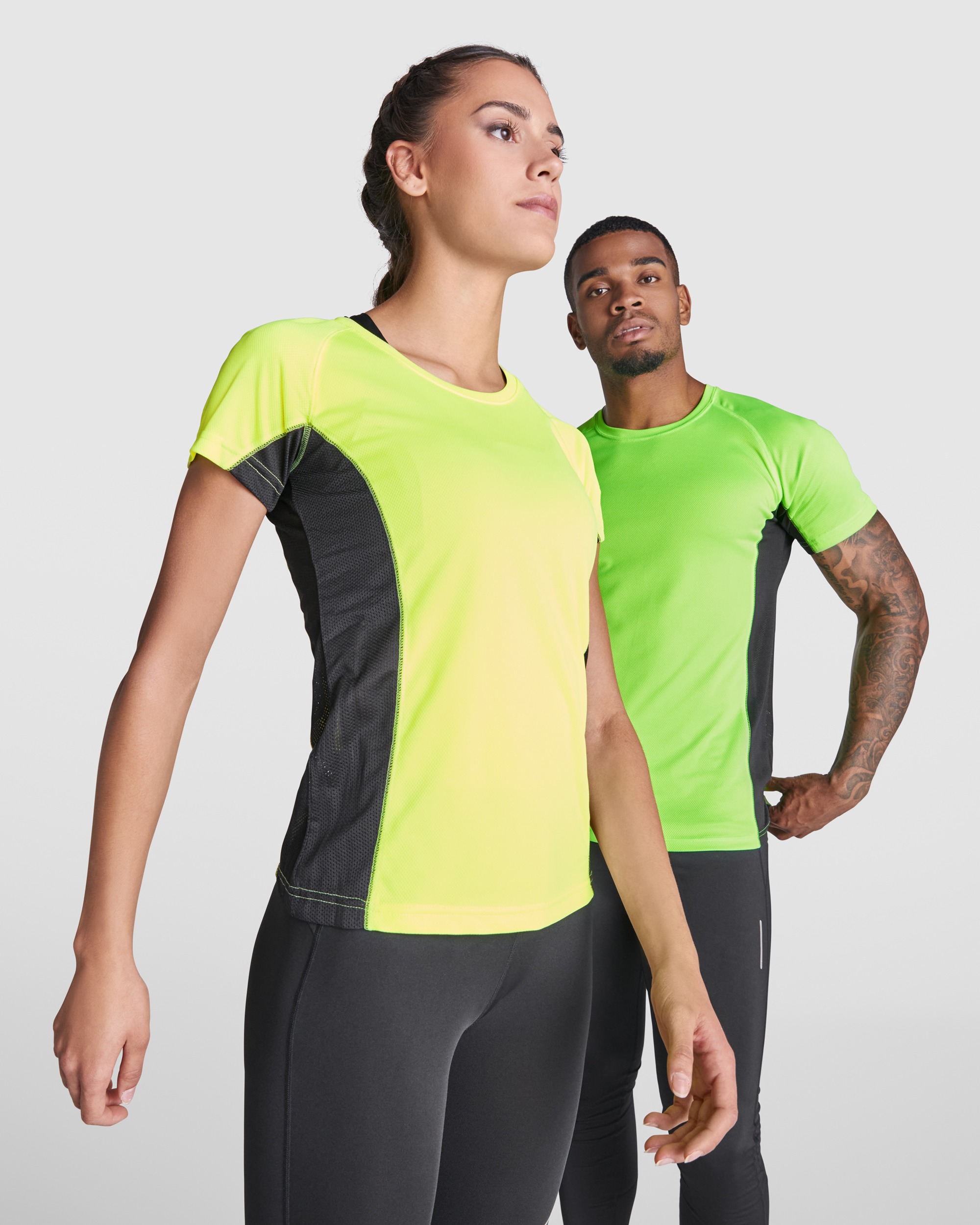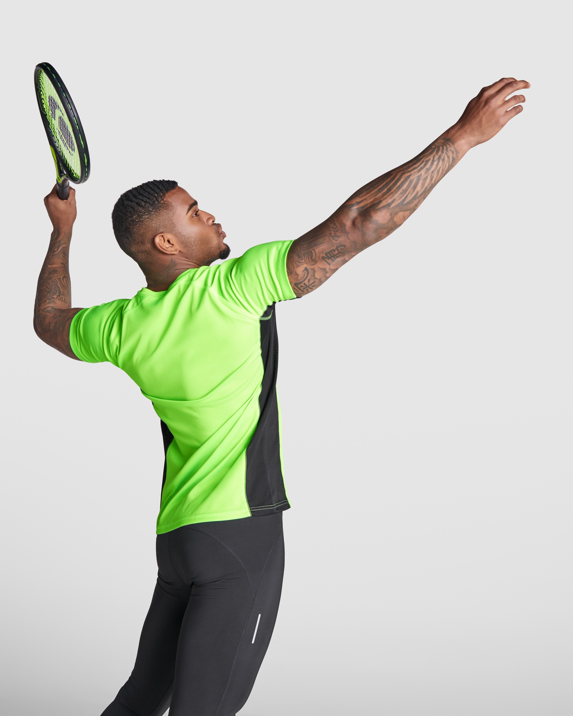 T-shirt tecnica traspirante bicolore con maniche raglan. Pannelli laterali in tessuto microforato. Girocollo e nastratura del colletto tono su tono.