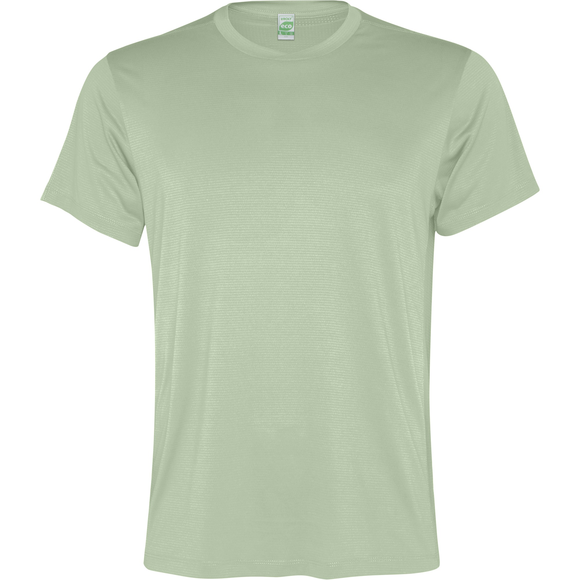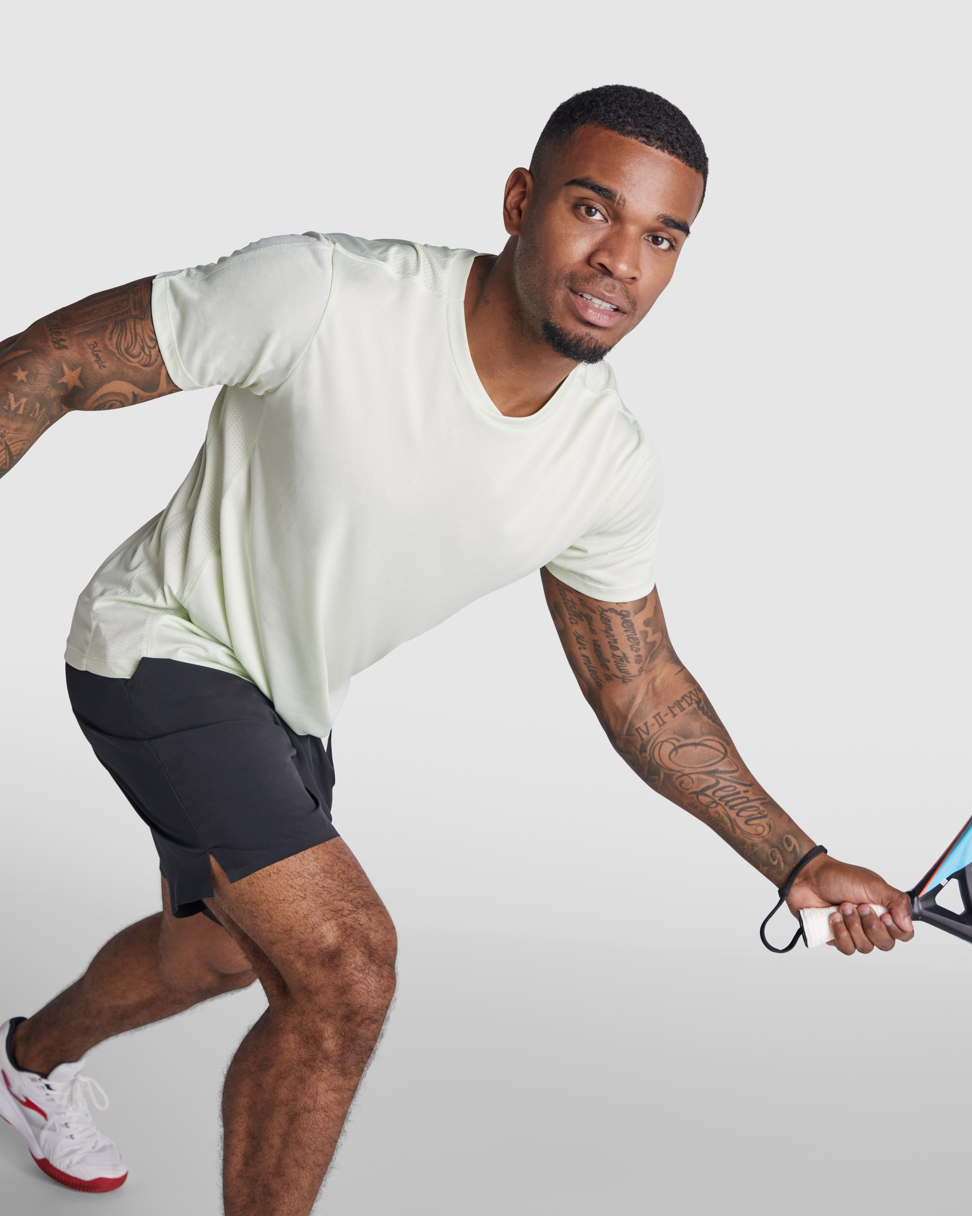 T-shirt tecnica traspirante a maniche corte. Roly Control Dry. Combinazione di tessuti leggeri ed elastici su pannelli spalle, schiena e fianchi. Girocollo e nastratura del colletto tono su tono. Cuciture in avanti. Certificazione GRS.