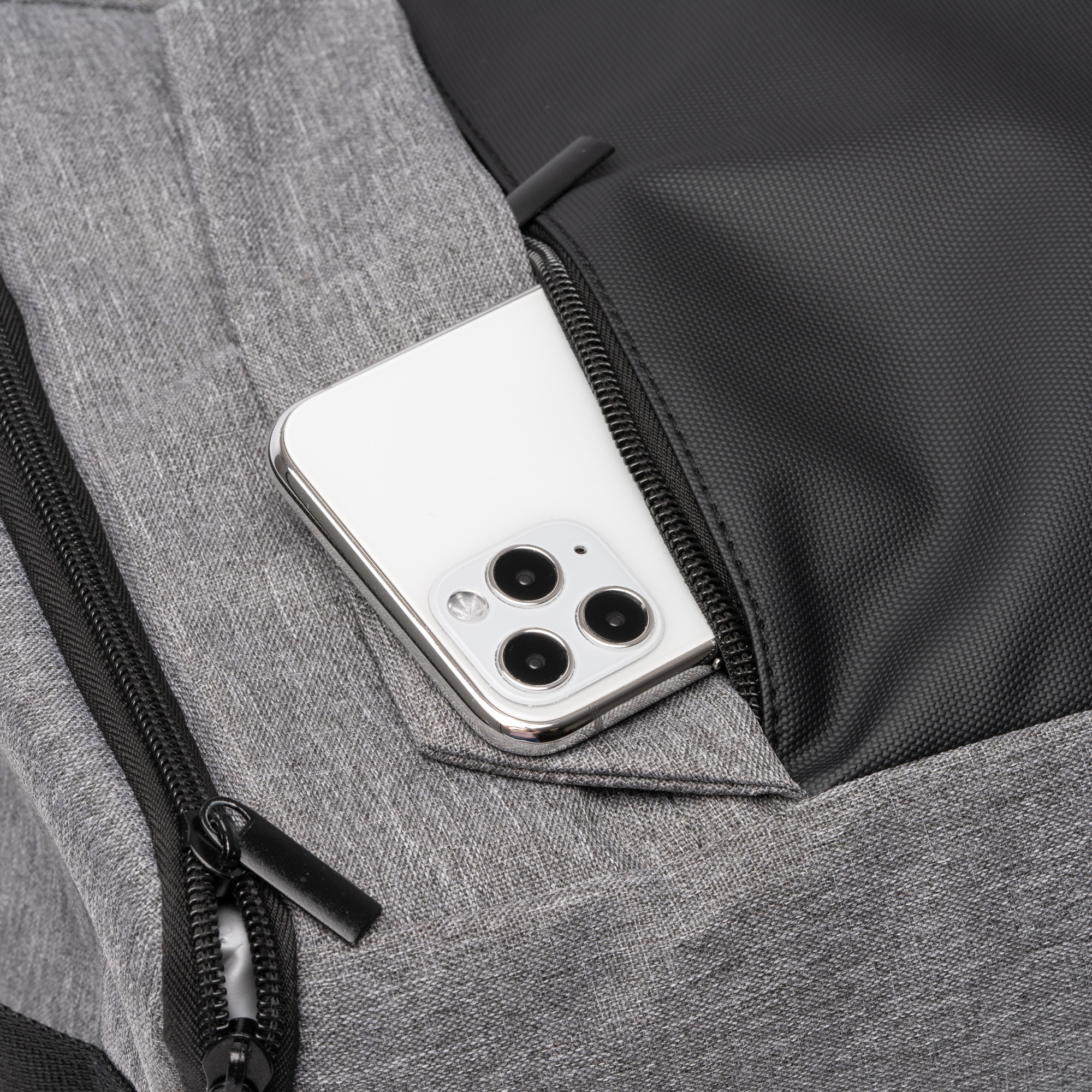 Borsa in pelle PU e RPET 300D con interno isotermico. Ampio scomparto principale e tasca esterna con chiusura a zip. Maniglia con rinforzo e tracolla regolabile.