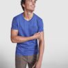 T-shirt a maniche corte con cuciture laterali. Girocollo a coste 1×1 (4 strati). Scollo nastrato in tessuto coordinato. Tasca a sul petto a sinistra.