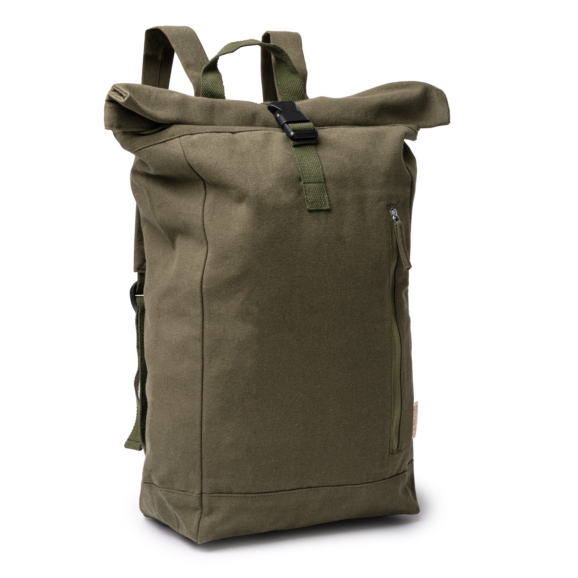 Zaino in cotone riciclato da 370 g/m². Ampio scomparto principale con apertura allungabile con zip e regolatore. Tasca frontale con chiusura a zip e tasca laterale. Capacità: 25L