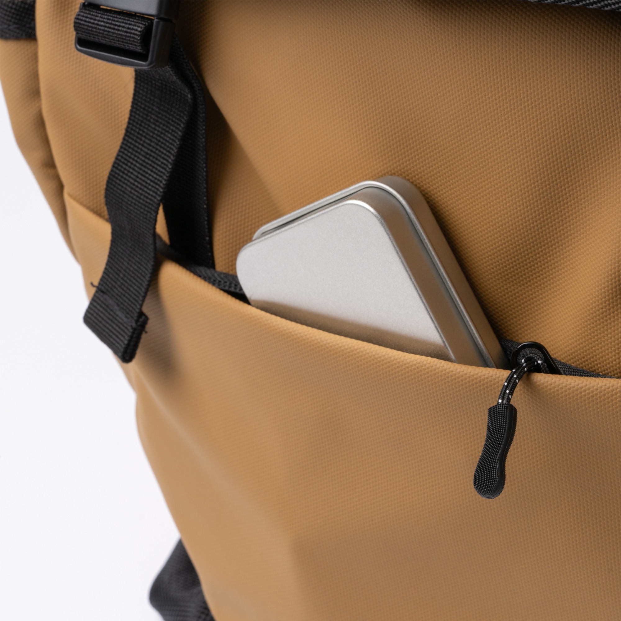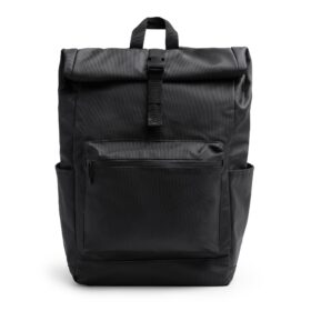 Zaino con pattina realizzato in pelle PU. Ampio scomparto interno con tasca per laptop da 15″. Manici e schienale imbottiti. Tasca esterna con patta, tasca esterna frontale e tasche laterali. Capacità: 20L.