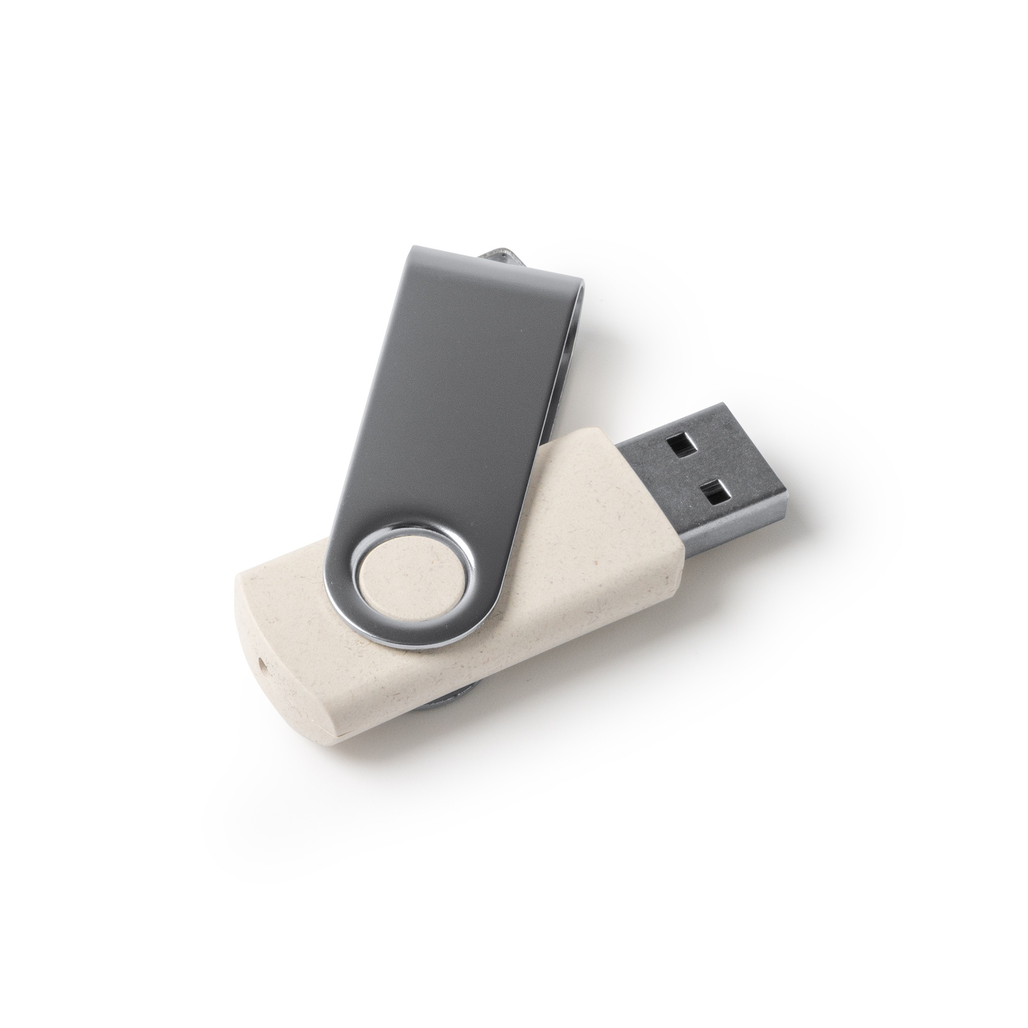 Chiavetta USB in fibra di grano con clip girevole in metallo. Confezione in scatola dal design ecologico.