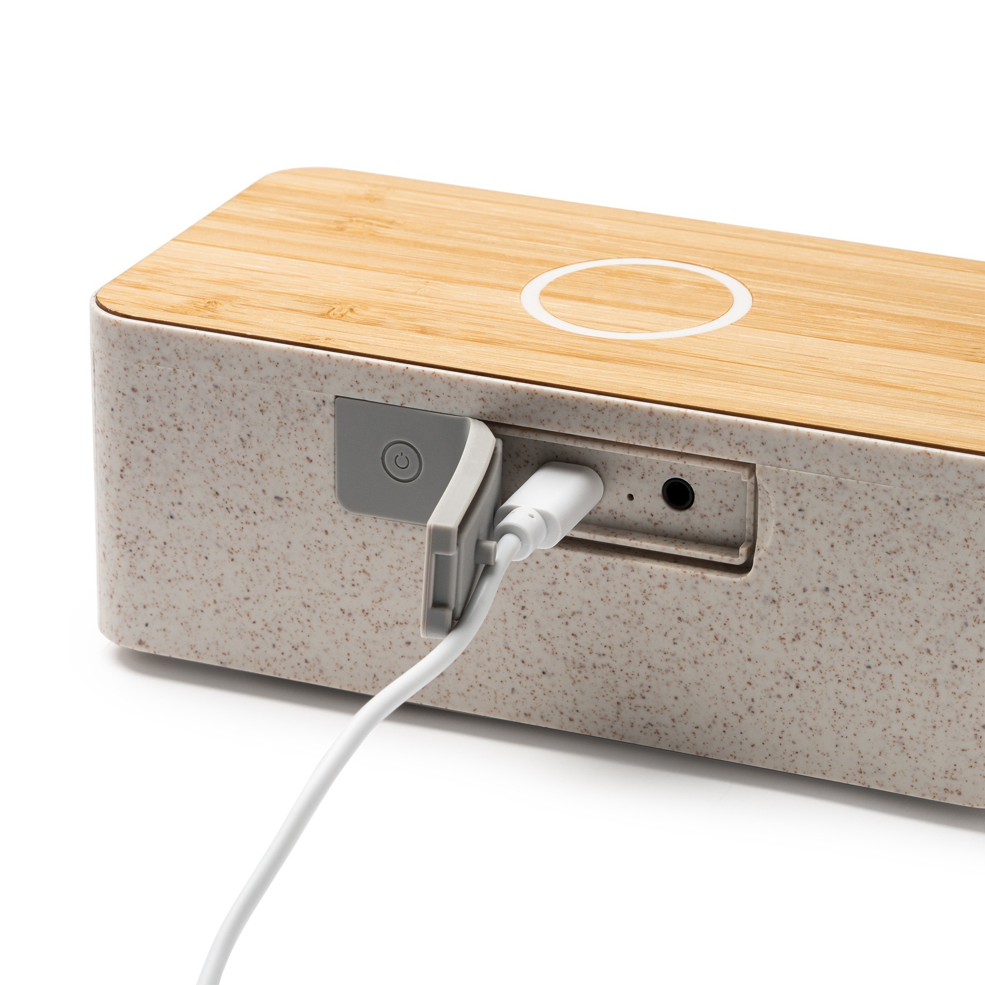 Cassa Bluetooth con base di ricarica wireless. Questo caricabatterie è stato progettato con un corpo in fibra di grano e una superficie in bambù. Ha una potenza 5W e un’uscita wireless da 10W. Include una batteria ricaricabile.