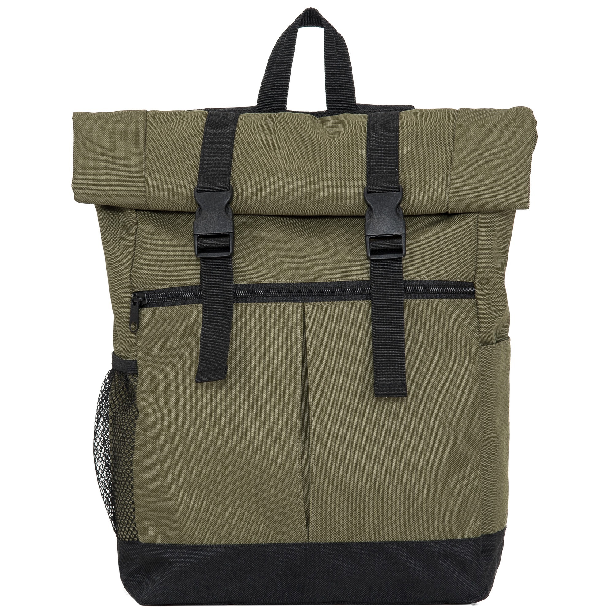 Zaino multifunzionale in poliestere 900D. Scomparto principale spazioso con cerniera e bottoni a scatto. Tasche laterali. Schienale e spallacci imbottiti.